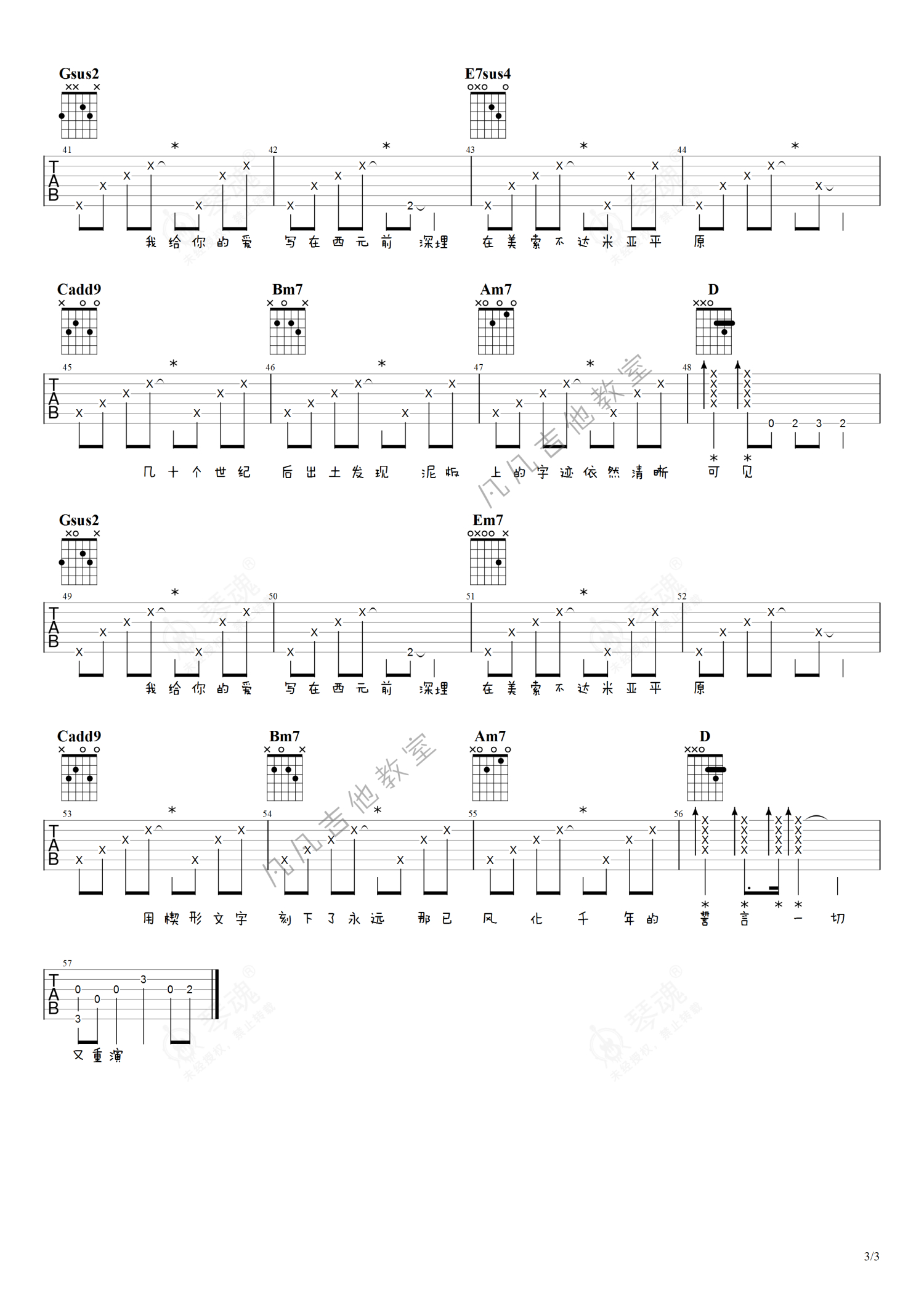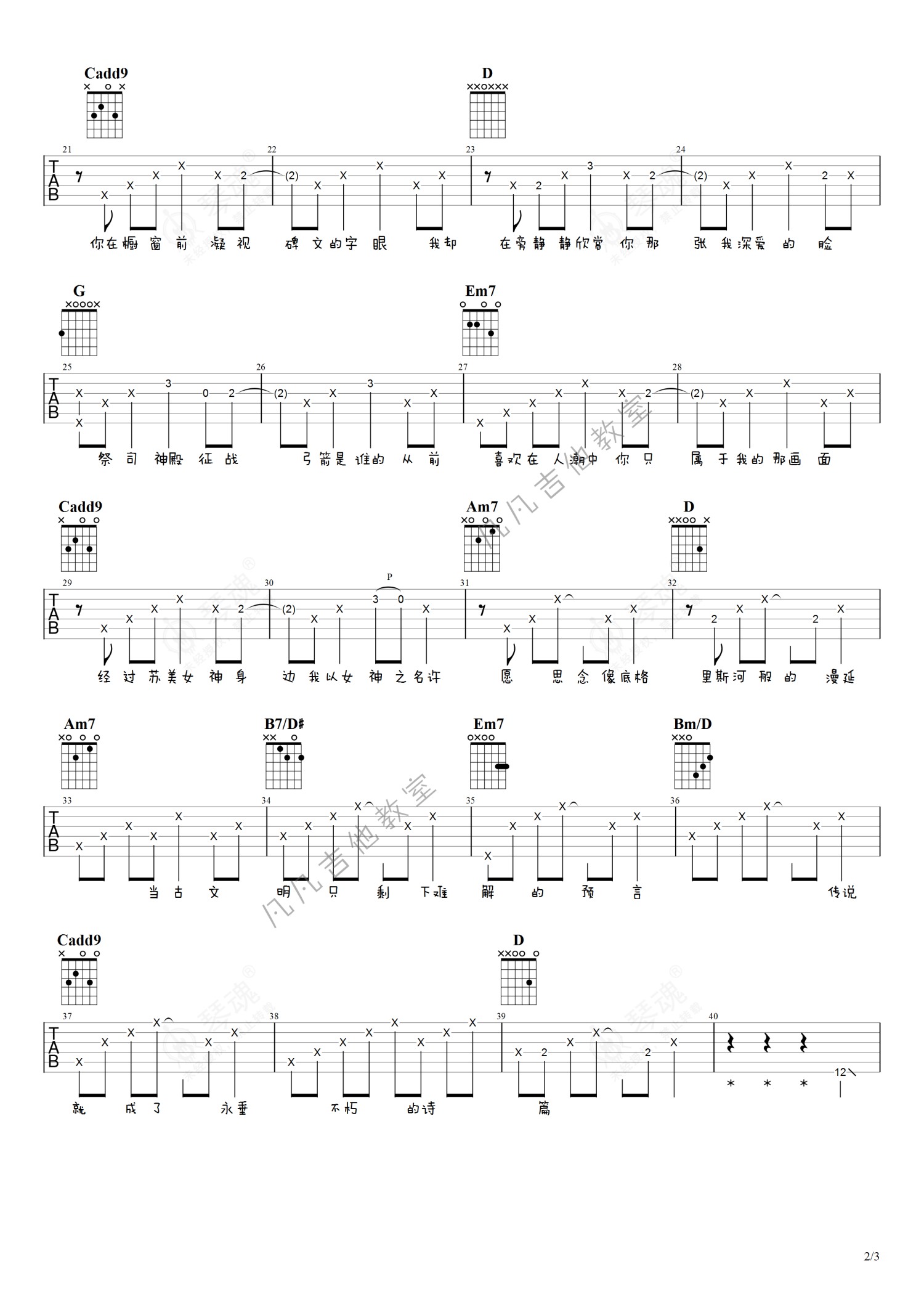 《爱在西元前》是周杰伦演唱的一首歌曲,进阶版,本吉他谱采用的是G调指法编配,这份吉他谱共有三张高清图谱,图谱由 @凡凡吉他教室 编配上传,图谱使用六线谱编配,包含吉他和弦指法、简谱以及歌词部分,曲谱配备了相关的视频提供浏览,使用这份爱在西元前吉他谱,可以让你更加方便地掌握这首歌曲的弹唱技巧,快来尝试吧。周杰伦《爱在西元前》吉他谱_G调吉他弹唱谱_进阶版。