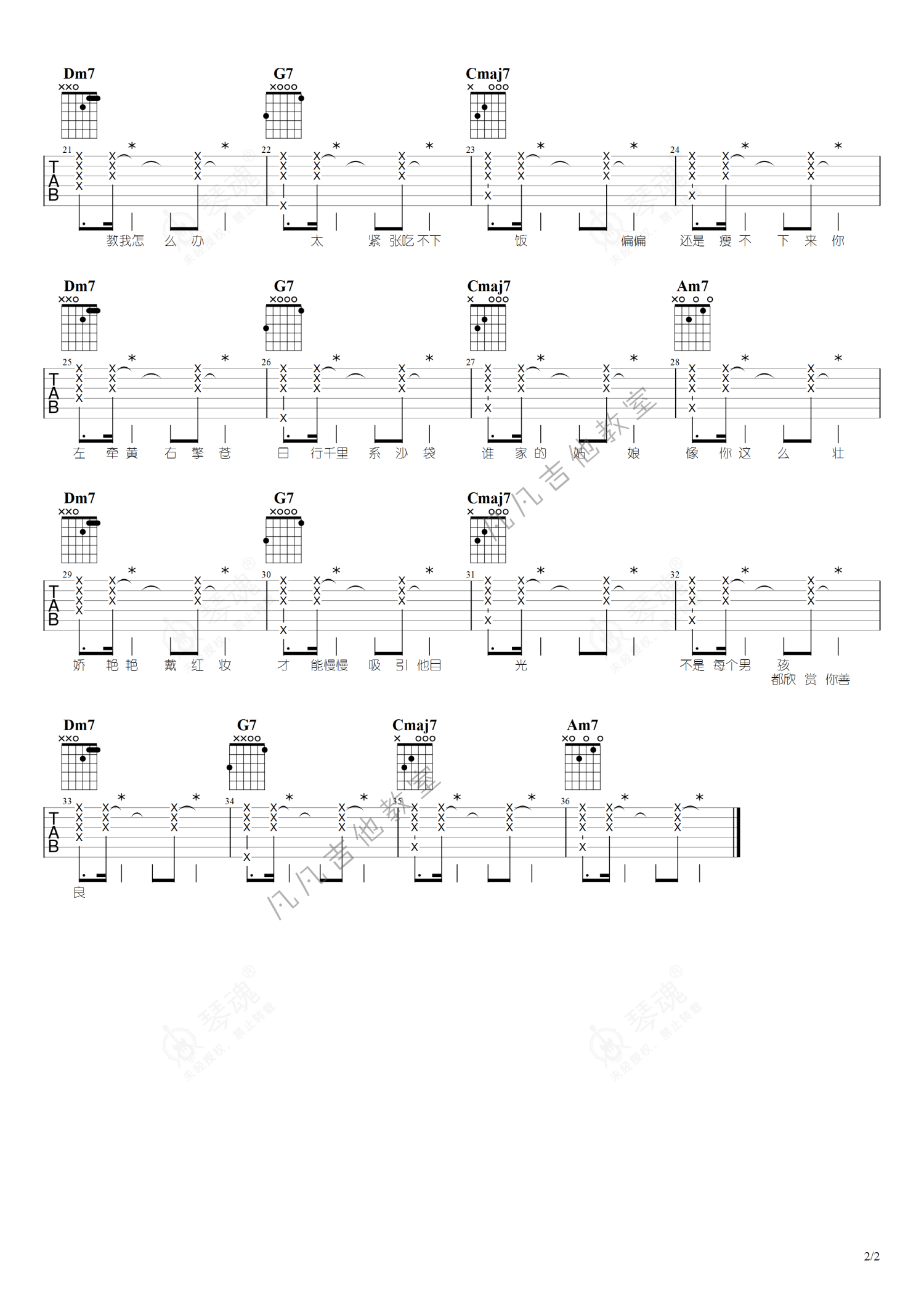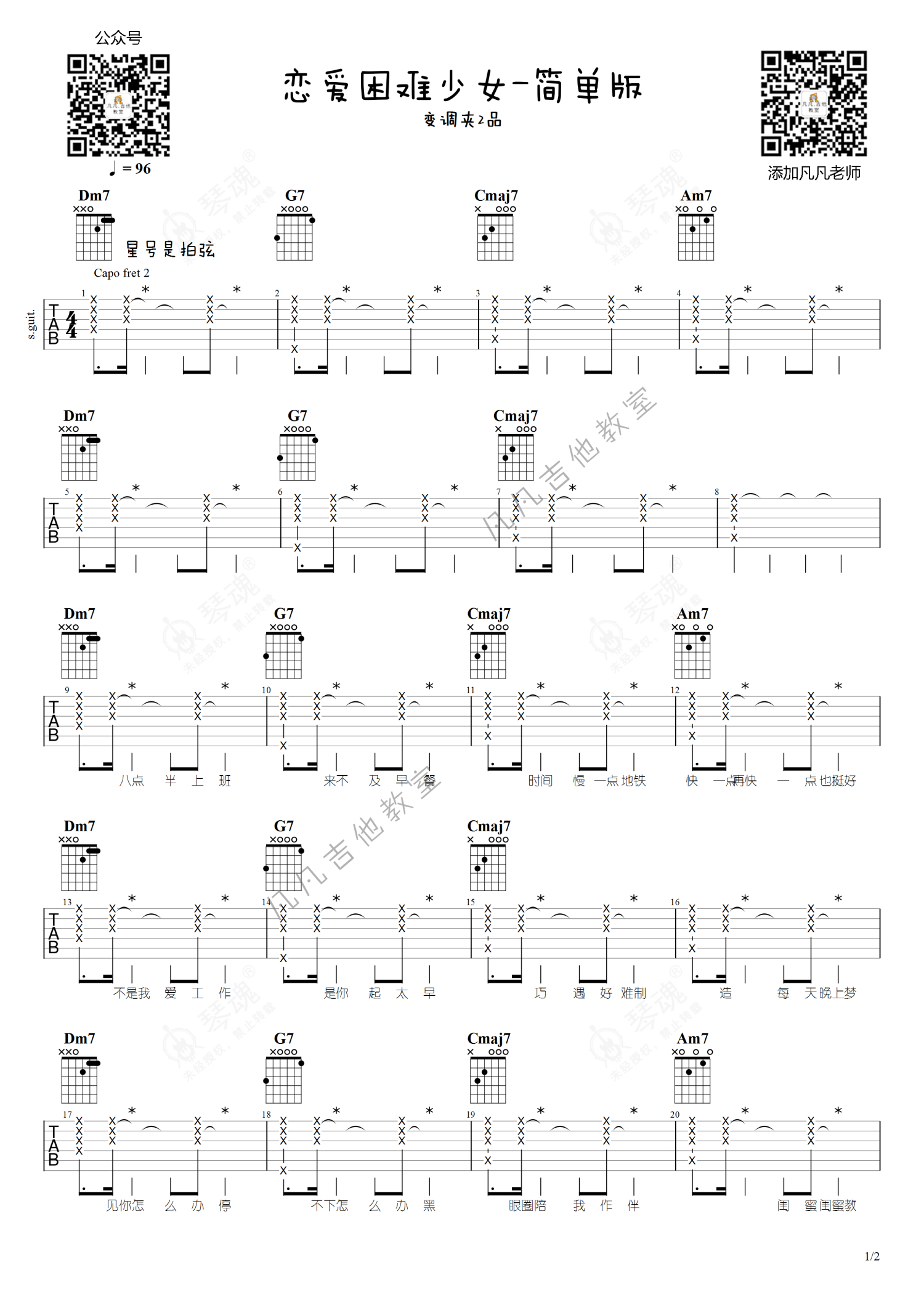 《恋爱困难少女》是ChiliChill演唱的一首歌曲,简单版,本吉他谱采用的是D调指法编配,这份吉他谱共有两张高清图谱,图谱由 @凡凡吉他教室 编配上传,图谱使用六线谱编配,包含吉他和弦指法、简谱以及歌词部分,曲谱配备了相关的视频提供浏览,使用这份恋爱困难少女吉他谱,可以让你更加方便地掌握这首歌曲的弹唱技巧,快来尝试吧。Funk曲风、爵士NeoSoul和弦。原地爆炸boom超好汀,听一天。