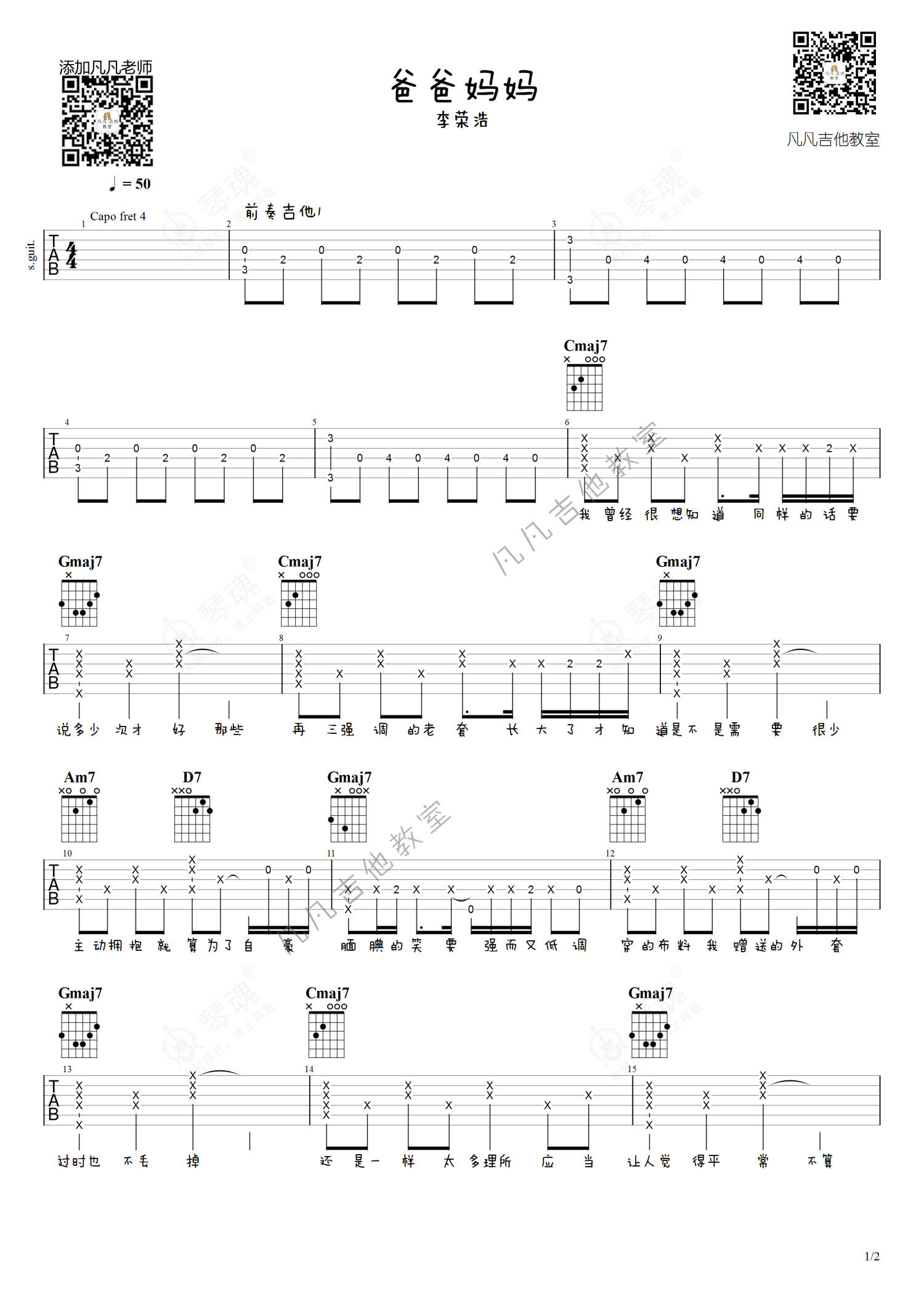 《爸爸妈妈》是李荣浩演唱的一首歌曲,原版,本吉他谱采用的是G调指法编配,这份吉他谱共有三张高清图谱,图谱由 @凡凡吉他教室 编配上传,图谱使用六线谱编配,包含吉他和弦指法、简谱以及歌词部分,曲谱配备了相关的视频提供浏览,使用这份爸爸妈妈吉他谱,可以让你更加方便地掌握这首歌曲的弹唱技巧,快来尝试吧。前奏需要两把吉他。或者分开先后录制。