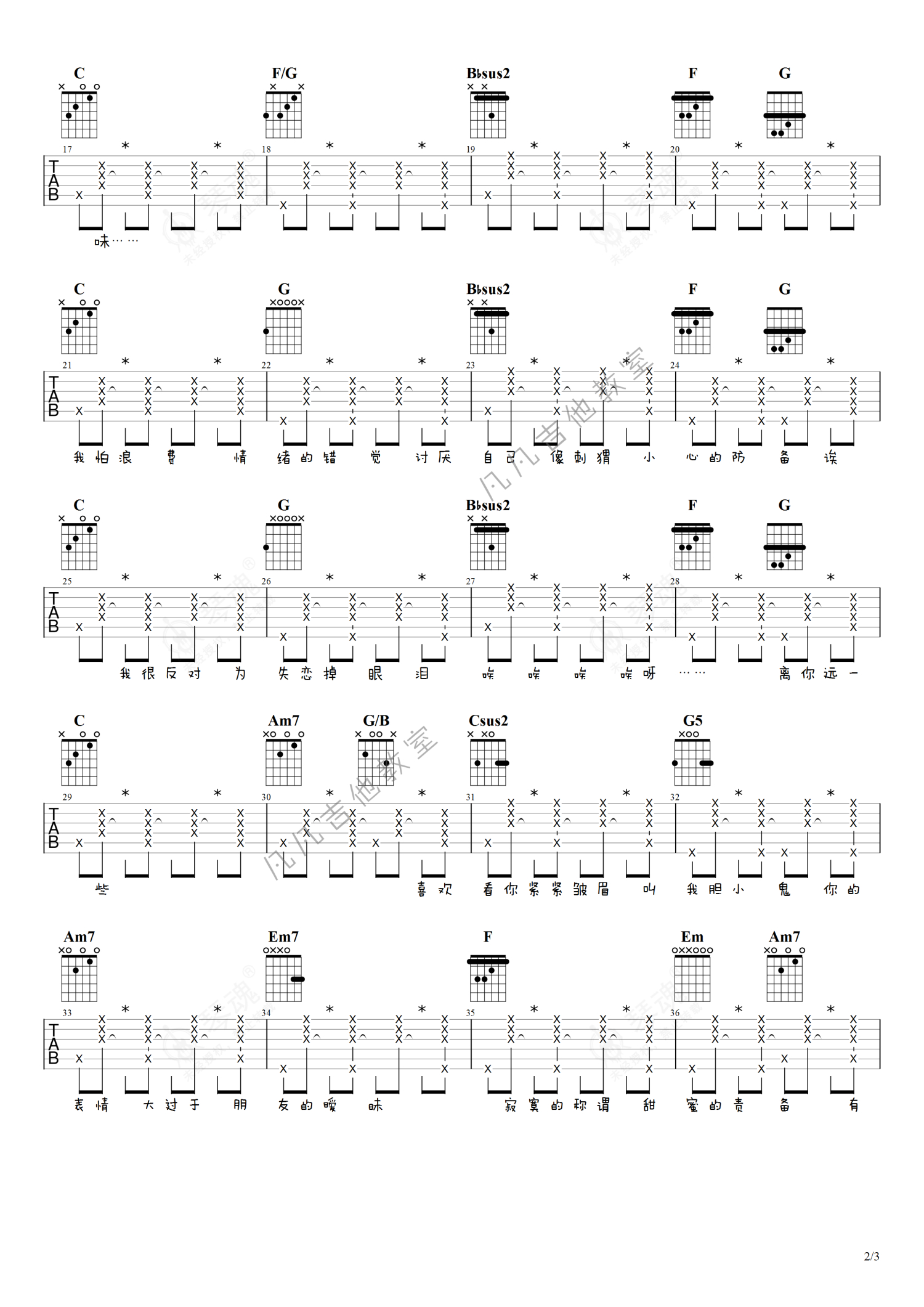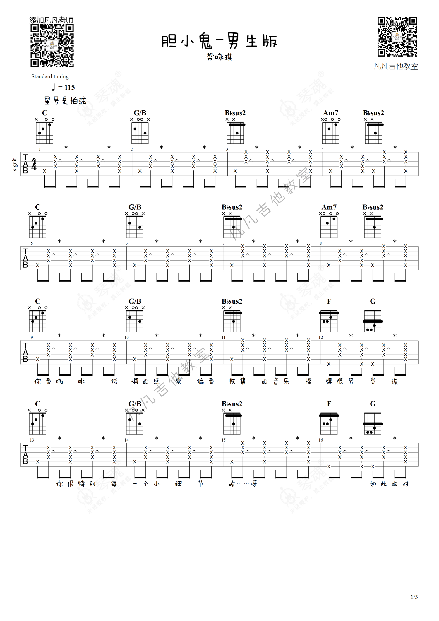 《胆小鬼》是梁咏琪演唱的一首歌曲,男生版-简单,本吉他谱采用的是C调指法编配,这份吉他谱共有三张高清图谱,图谱由 @凡凡吉他教室 编配上传,图谱使用六线谱编配,包含吉他和弦指法、简谱以及歌词部分,曲谱配备了相关的视频提供浏览,使用这份胆小鬼吉他谱,可以让你更加方便地掌握这首歌曲的弹唱技巧,快来尝试吧。梁咏琪《胆小鬼》吉他谱_C调吉他弹唱谱_男生版-简单。