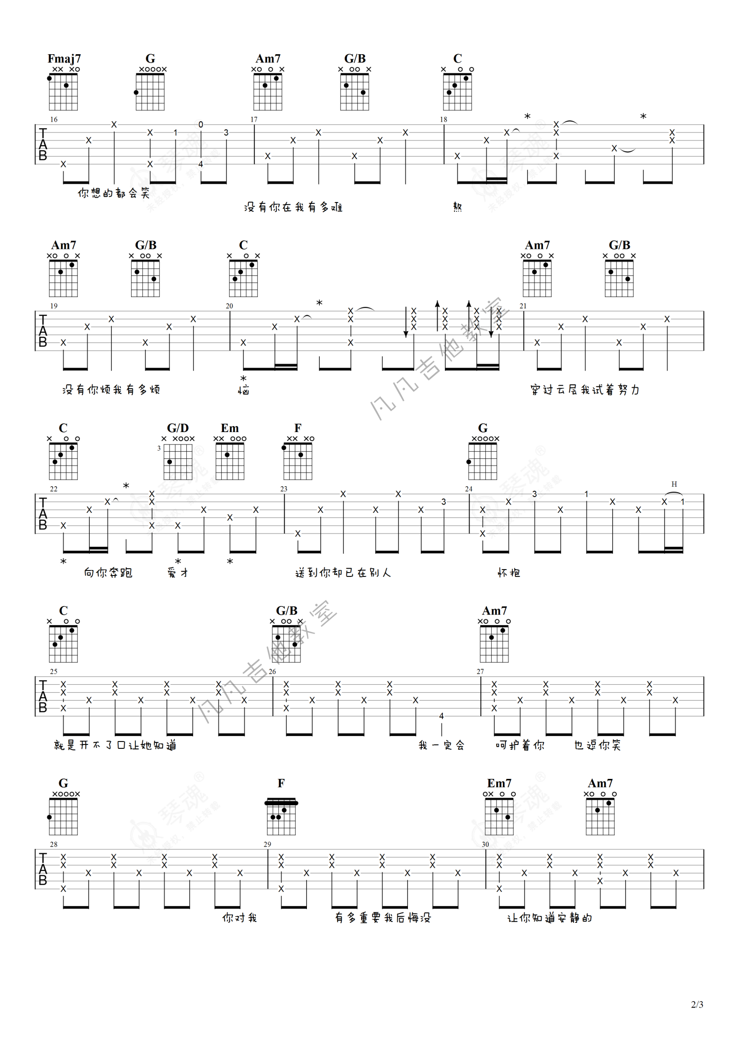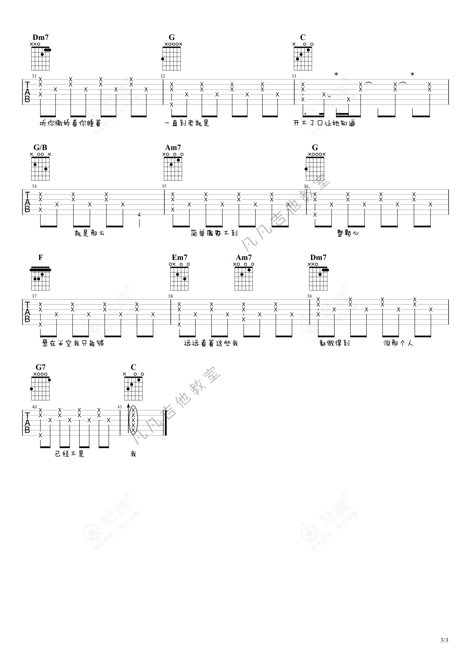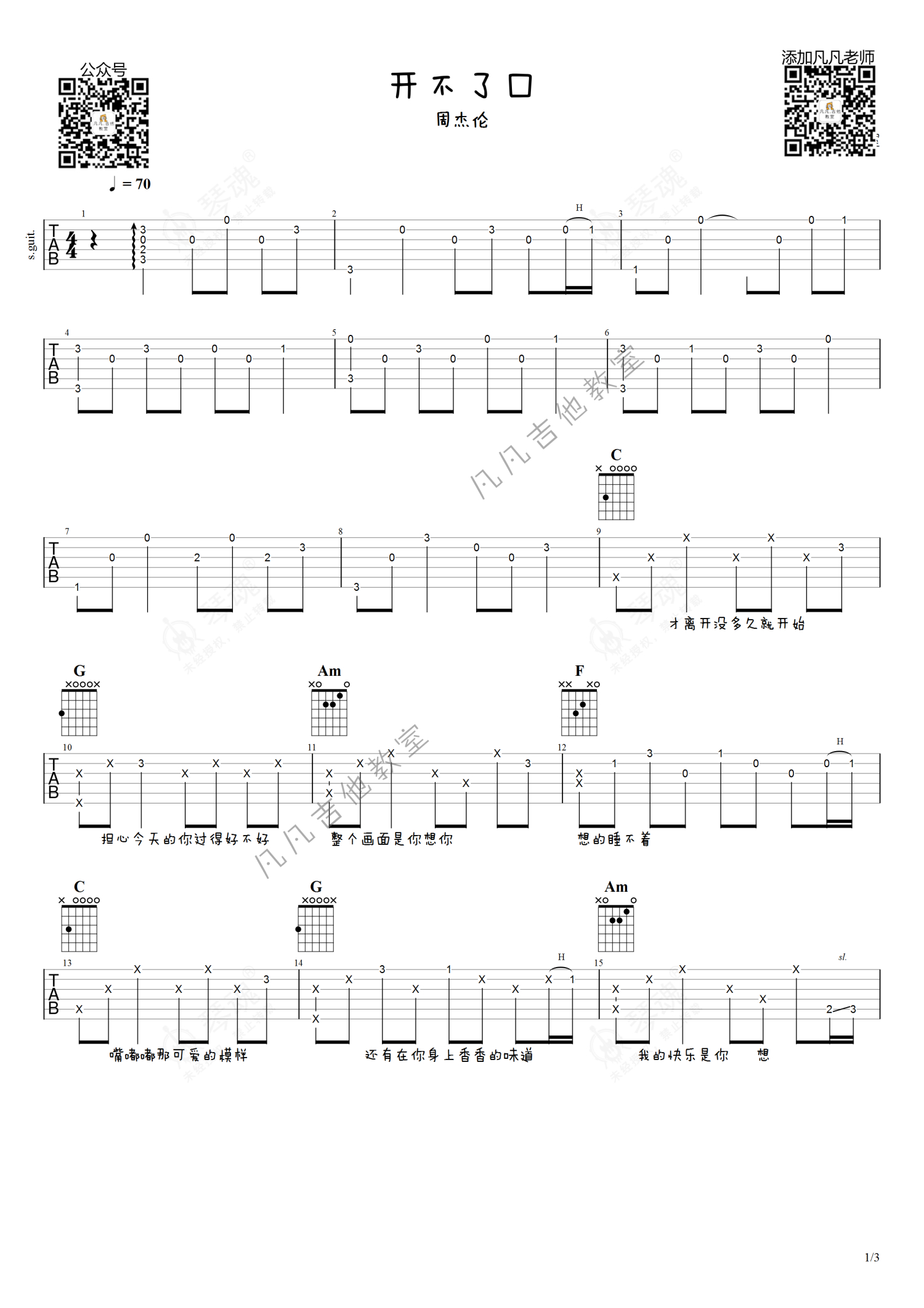 《开不了口》是周杰伦演唱的一首歌曲,简单版,本吉他谱采用的是C调指法编配,这份吉他谱共有三张高清图谱,图谱由 @凡凡吉他教室 编配上传,图谱使用六线谱编配,包含吉他和弦指法、简谱以及歌词部分,曲谱配备了相关的视频提供浏览,使用这份开不了口吉他谱,可以让你更加方便地掌握这首歌曲的弹唱技巧,快来尝试吧。周杰伦《开不了口》吉他谱_C调吉他弹唱谱_简单版。