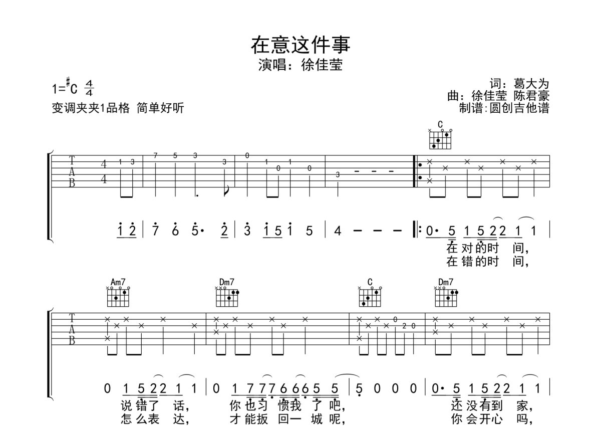 《在意这件事》是徐佳莹演唱的一首歌曲,本吉他谱采用的是C调指法编配,这份吉他谱共有两张高清图谱,图谱由 @圆创吉他谱 编配上传,图谱使用六线谱编配,包含吉他和弦指法、简谱以及歌词部分,曲谱配备了相关的音频提供试听,使用这份在意这件事吉他谱,可以让你更加方便地掌握这首歌曲的弹唱技巧,快来尝试吧。
