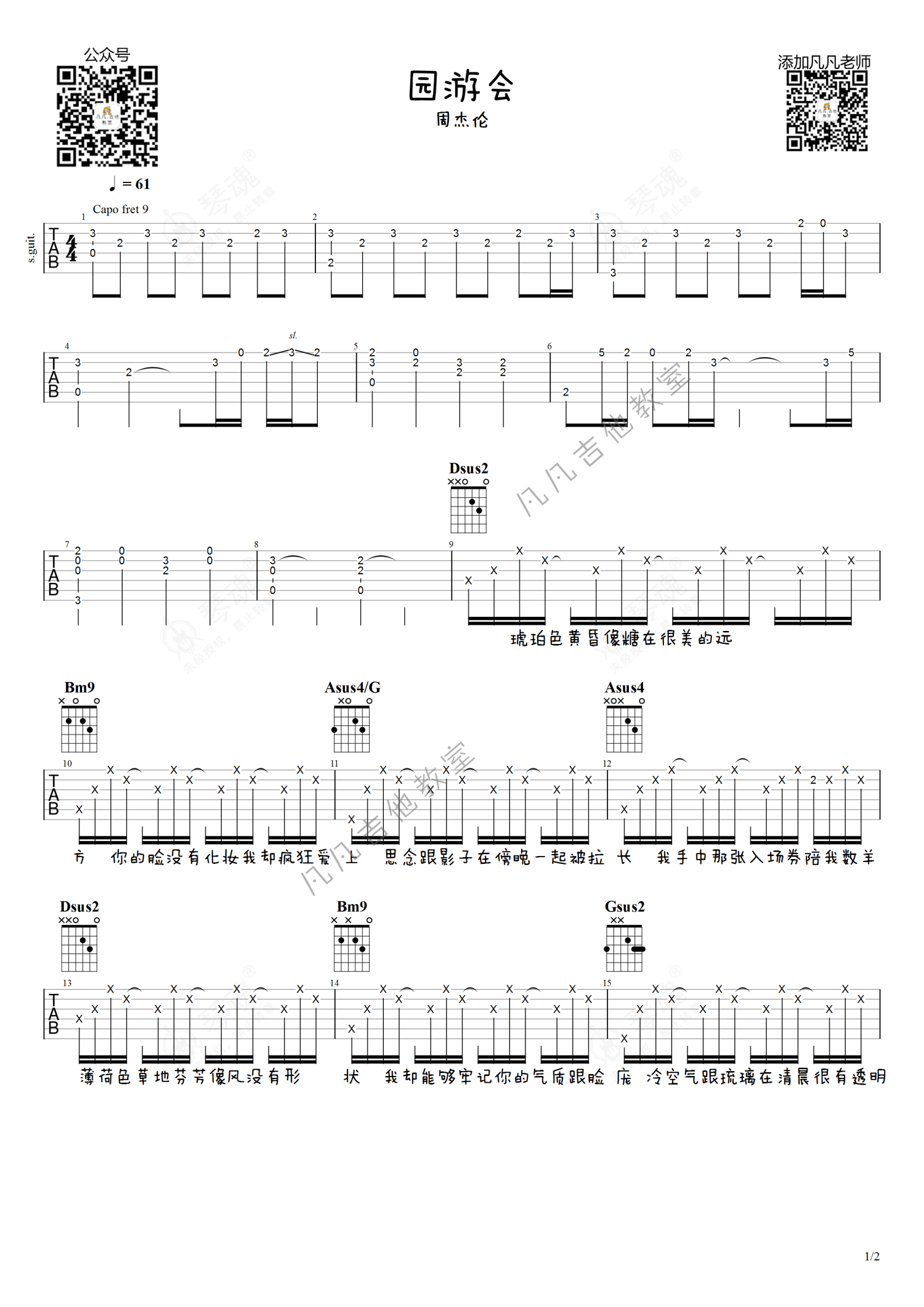 《园游会》是周杰伦演唱的一首歌曲,男生版,本吉他谱采用的是D调指法编配,这份吉他谱共有两张高清图谱,图谱由 @凡凡吉他教室 编配上传,图谱使用六线谱编配,包含吉他和弦指法、简谱以及歌词部分,曲谱配备了相关的视频提供浏览,使用这份园游会吉他谱,可以让你更加方便地掌握这首歌曲的弹唱技巧,快来尝试吧。周杰伦《园游会》吉他谱_D调吉他弹唱谱_男生版。