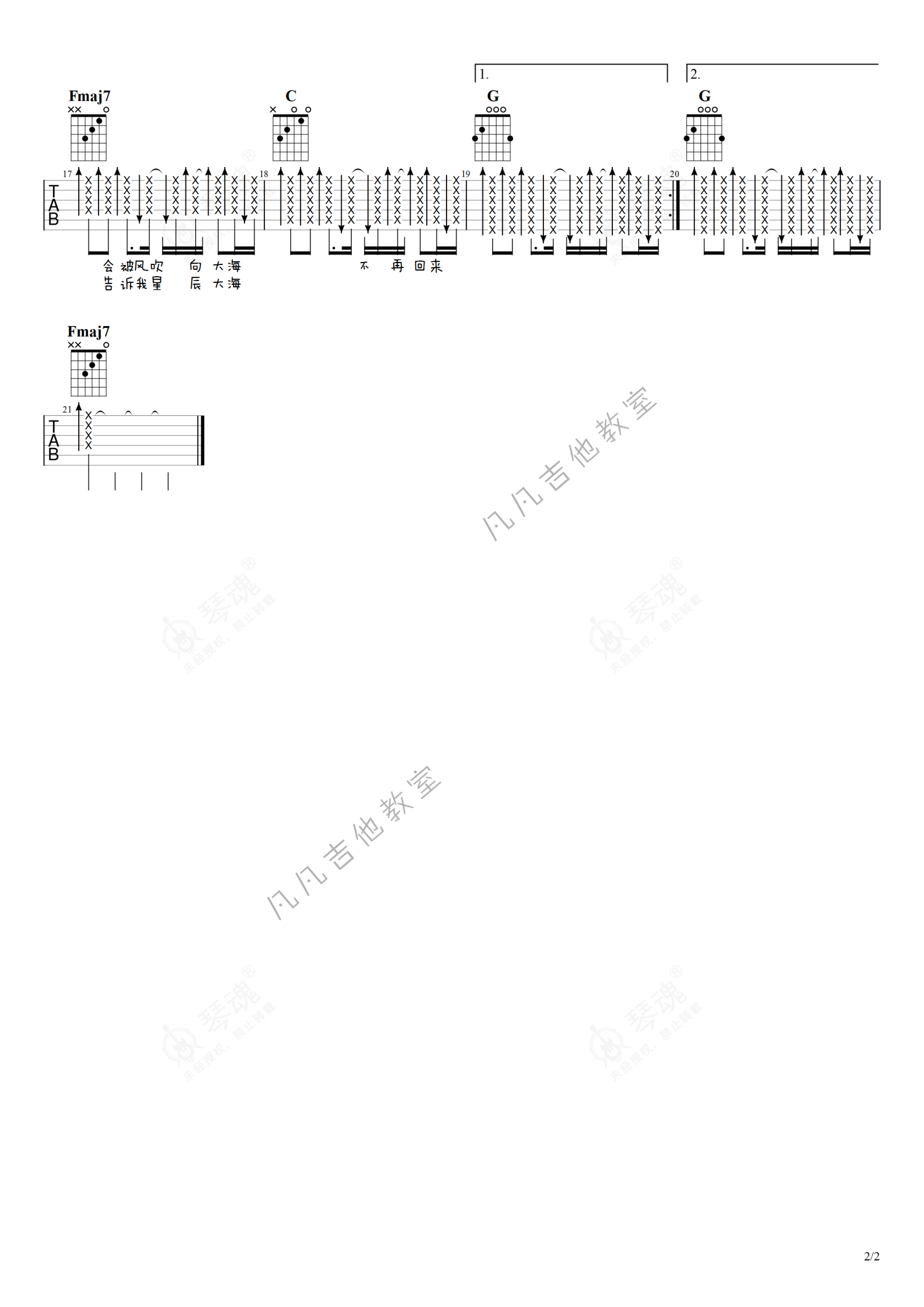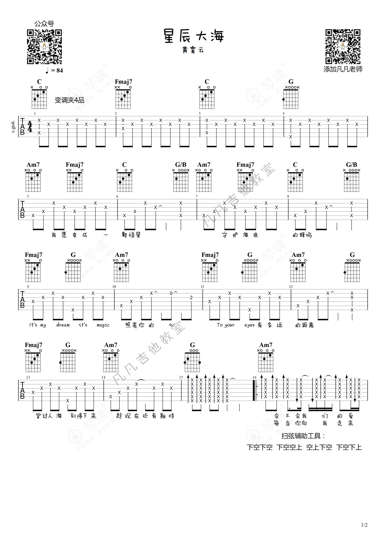 《星辰大海》是黄霄云演唱的一首歌曲,简单版,本吉他谱采用的是C调指法编配,这份吉他谱共有两张高清图谱,图谱由 @凡凡吉他教室 编配上传,图谱使用六线谱编配,包含吉他和弦指法、简谱以及歌词部分,曲谱配备了相关的视频提供浏览,使用这份星辰大海吉他谱,可以让你更加方便地掌握这首歌曲的弹唱技巧,快来尝试吧。免费吉他谱「凡凡吉他编配」。