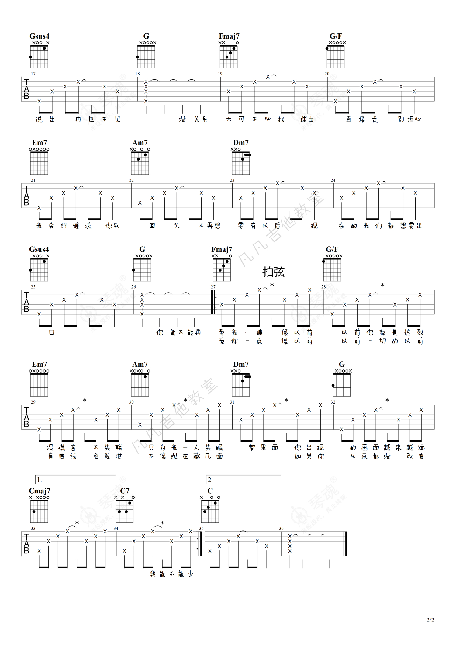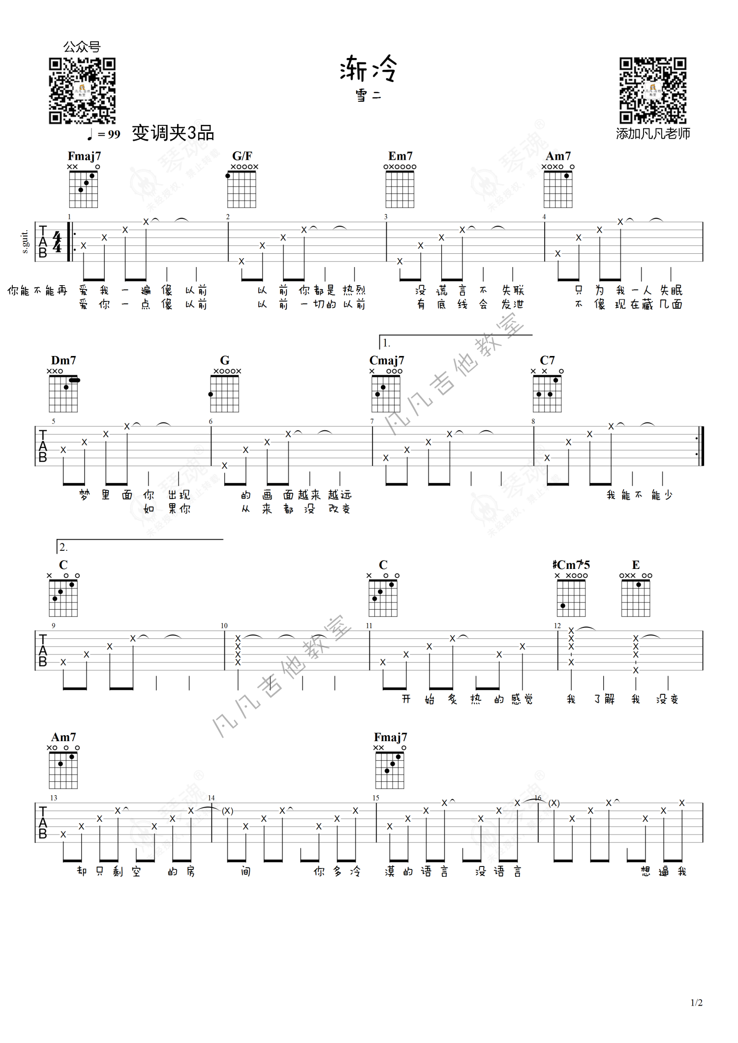 《渐冷》是雪二演唱的一首歌曲,简单版,本吉他谱采用的是C调指法编配,这份吉他谱共有两张高清图谱,图谱由 @凡凡吉他教室 编配上传,图谱使用六线谱编配,包含吉他和弦指法、简谱以及歌词部分,曲谱配备了相关的视频提供浏览,使用这份渐冷吉他谱,可以让你更加方便地掌握这首歌曲的弹唱技巧,快来尝试吧。雪二《渐冷》吉他谱_C调吉他弹唱谱_简单版。