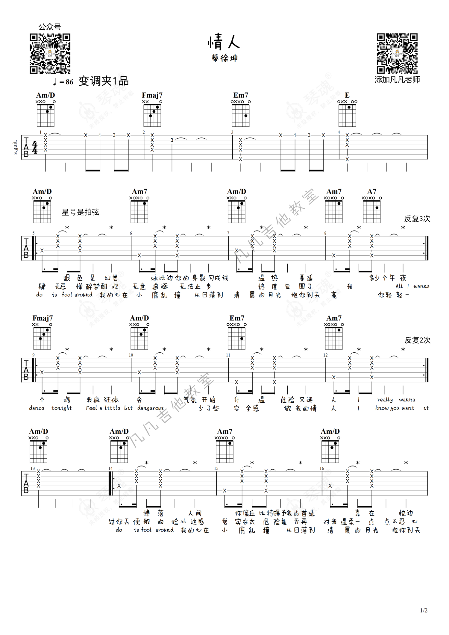 《情人》是蔡徐坤演唱的一首歌曲,简单版,本吉他谱采用的是C调指法编配,这份吉他谱共有两张高清图谱,图谱由 @凡凡吉他教室 编配上传,图谱使用六线谱编配,包含吉他和弦指法、简谱以及歌词部分,曲谱配备了相关的视频提供浏览,使用这份情人吉他谱,可以让你更加方便地掌握这首歌曲的弹唱技巧,快来尝试吧。蔡徐坤《情人》吉他谱_C调吉他弹唱谱_简单版。