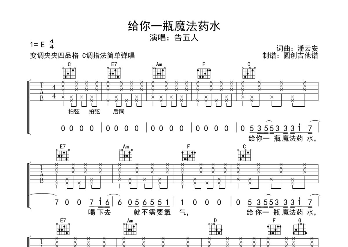 告五人《给你一瓶魔法药水》吉他谱 - C调弹唱六线谱