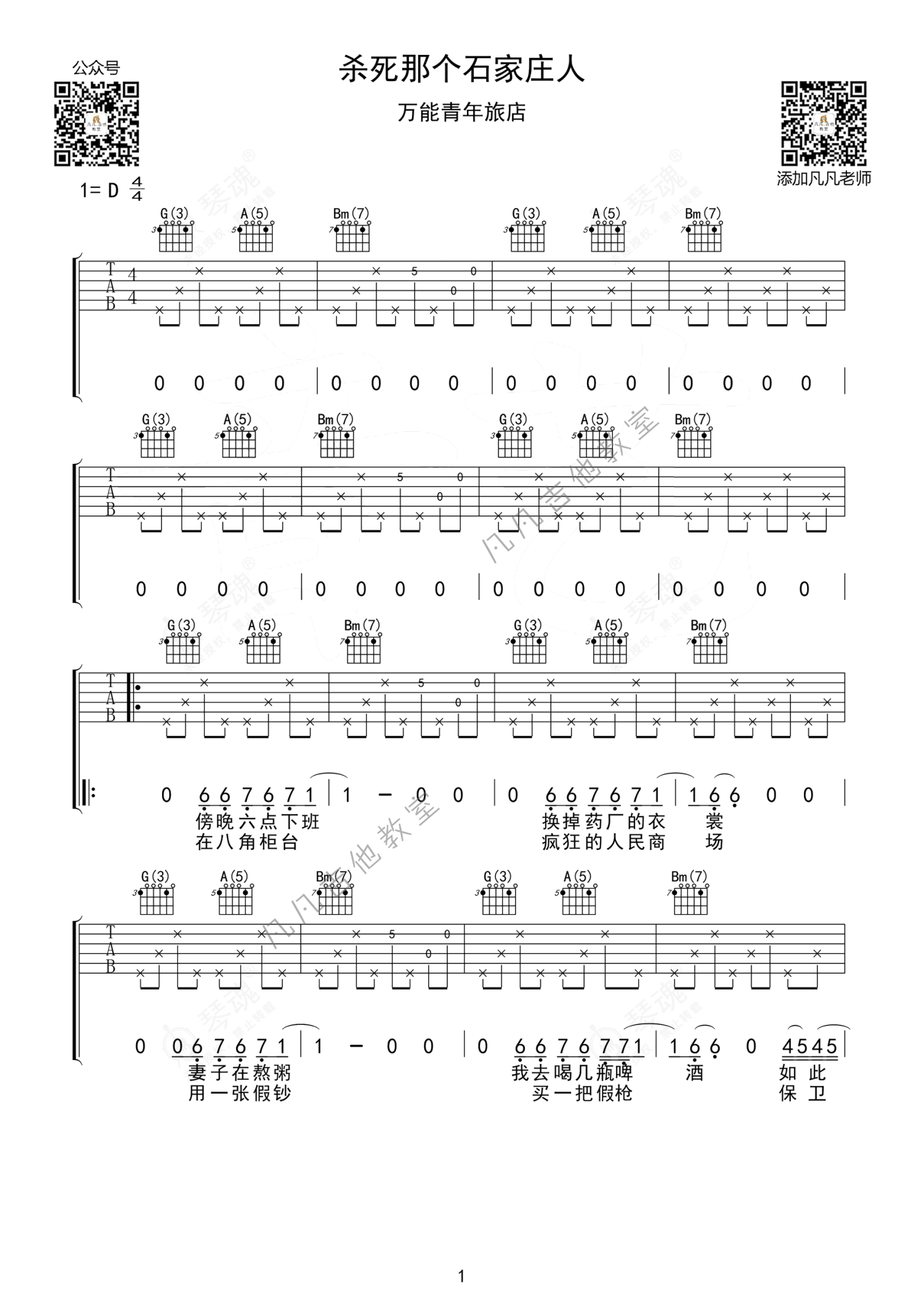 《杀死那个石家庄人》是万能青年旅店演唱的一首歌曲,刘大壮简单版,本吉他谱采用的是D调指法编配,这份吉他谱共有三张高清图谱,图谱由 @凡凡吉他教室 编配上传,图谱使用六线谱编配,包含吉他和弦指法、简谱以及歌词部分,曲谱配备了相关的视频提供浏览,使用这份杀死那个石家庄人吉他谱,可以让你更加方便地掌握这首歌曲的弹唱技巧,快来尝试吧。万能青年旅店《杀死那个石家庄人》吉他谱_D调吉他弹唱谱_刘大壮简单版。