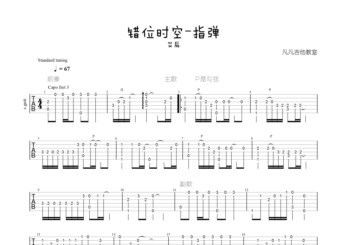 《错位时空》是艾辰演唱的一首歌曲,指弹简单版,本吉他谱采用的是C调指法编配,这份吉他谱共有两张高清图谱,图谱由 @凡凡吉他教室 编配上传,图谱使用六线谱编配,曲谱配备了相关的音频提供试听,使用这份错位时空吉他谱,可以让你更加方便地掌握这首歌曲的演奏技巧,快来尝试吧。节奏做了简化,方便所有层次的朋友学习。可以试听音频。