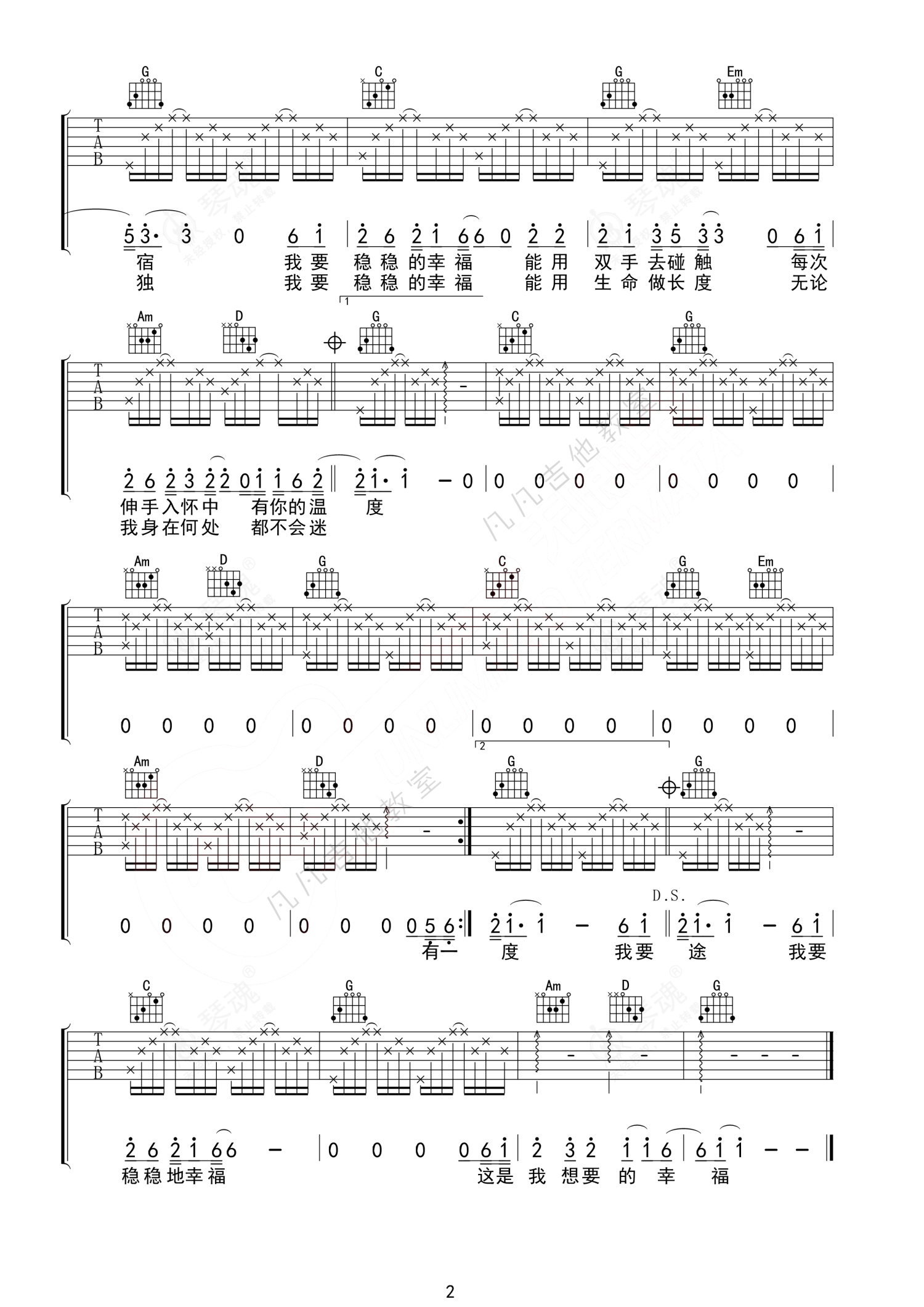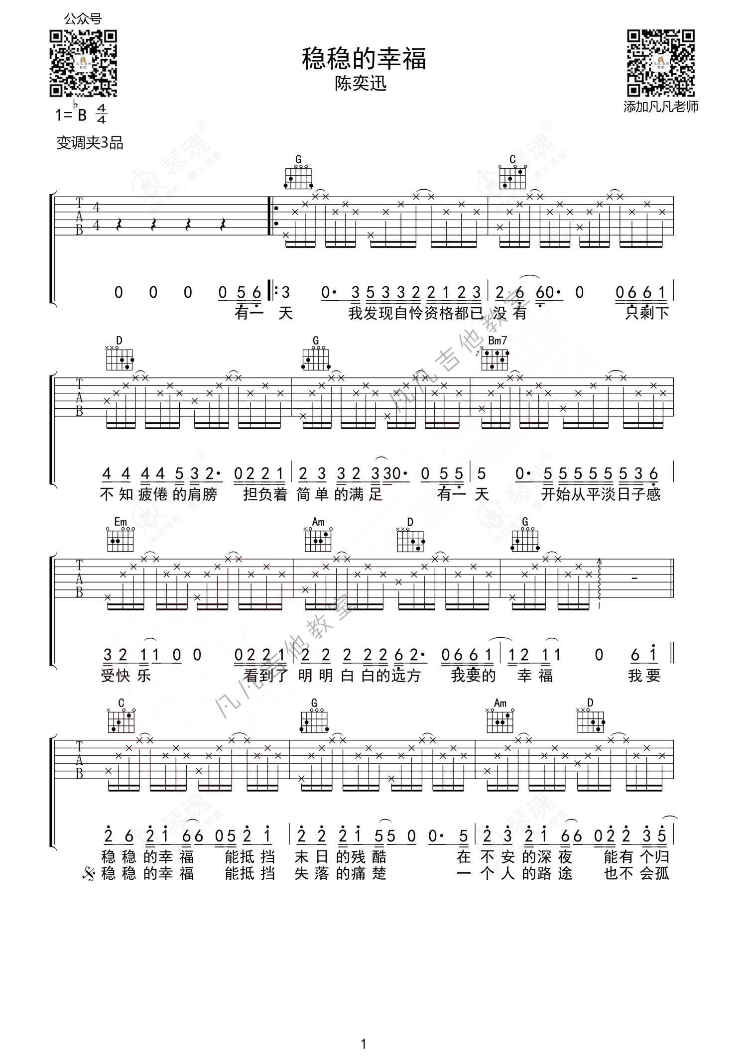 《稳稳的幸福》是陈奕迅演唱的一首歌曲,简单版,本吉他谱采用的是G调指法编配,这份吉他谱共有两张高清图谱,图谱由 @凡凡吉他教室 编配上传,图谱使用六线谱编配,包含吉他和弦指法、简谱以及歌词部分,使用这份稳稳的幸福吉他谱,可以让你更加方便地掌握这首歌曲的弹唱技巧,快来尝试吧。免费(凡凡吉他编配)。