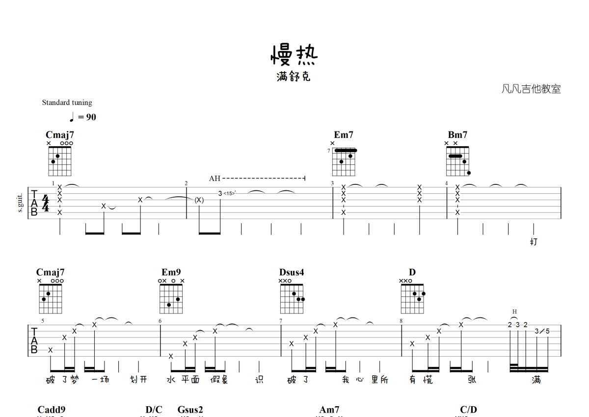 《慢热》是满舒克演唱的一首歌曲,进阶版,本吉他谱采用的是G调指法编配,这份吉他谱共有两张高清图谱,图谱由 @凡凡吉他教室 编配上传,图谱使用六线谱编配,包含吉他和弦指法、简谱以及歌词部分,曲谱配备了相关的视频提供浏览,使用这份慢热吉他谱,可以让你更加方便地掌握这首歌曲的弹唱技巧,快来尝试吧。满舒克《慢热》吉他谱_G调吉他弹唱谱_进阶版。