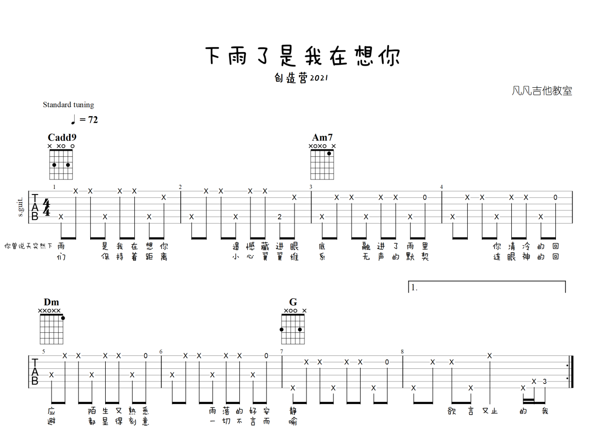 《下雨了是我在想你》是林墨/甘望星/何屹繁/利路修/任胤蓬/硬糖少女303郑乃馨演唱的一首歌曲,原版,本吉他谱采用的是C调指法编配,这份吉他谱共有两张高清图谱,图谱由 @凡凡吉他教室 编配上传,图谱使用六线谱编配,包含吉他和弦指法、简谱以及歌词部分,使用这份下雨了是我在想你吉他谱,可以让你更加方便地掌握这首歌曲的弹唱技巧,快来尝试吧。林墨/甘望星/何屹繁/利路修/任胤蓬/硬糖少女303郑乃馨《下雨了是我在想你》吉他谱_C调吉他弹唱谱_原版。