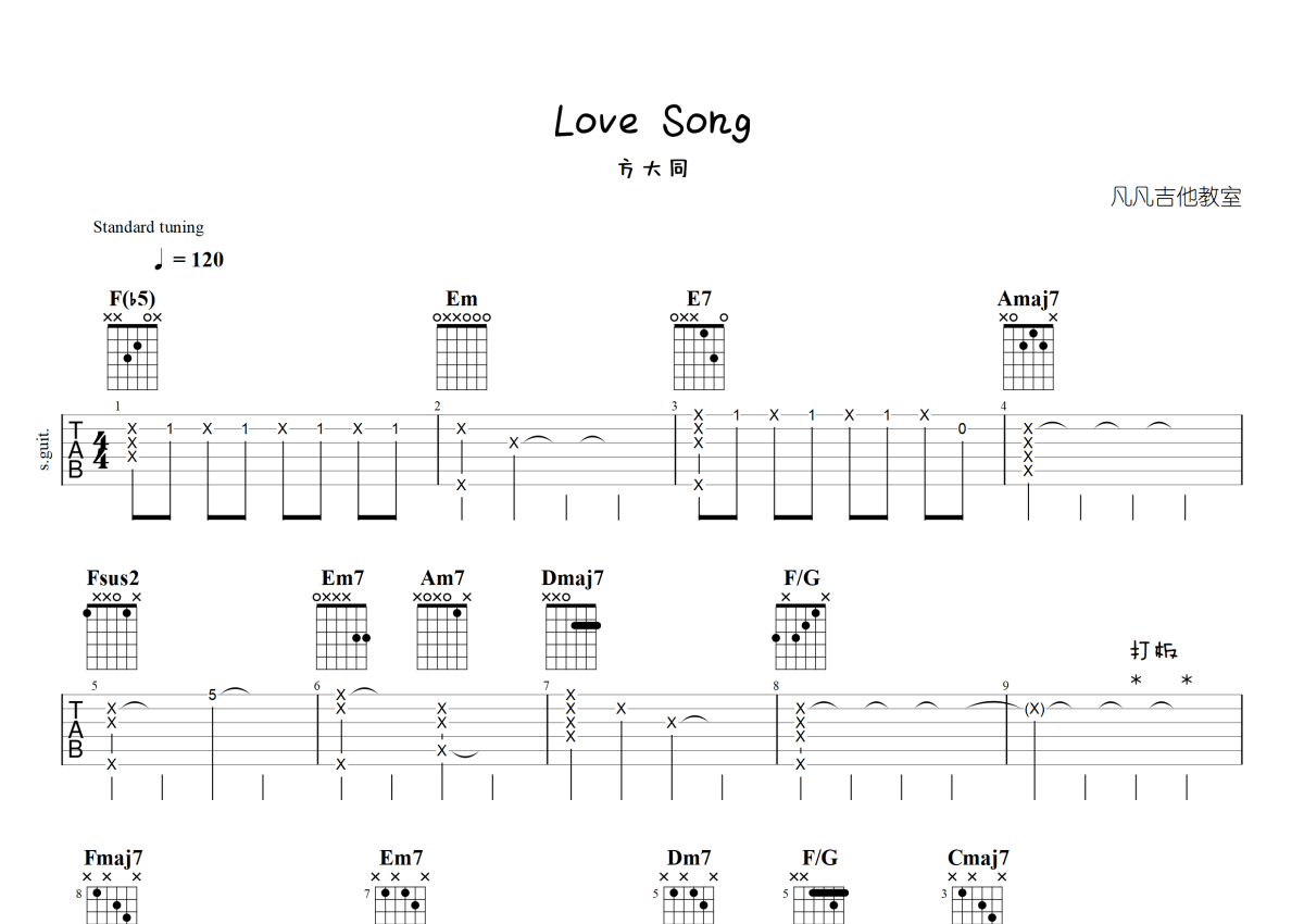《Love Song》是方大同演唱的一首歌曲,原版,本吉他谱采用的是C调指法编配,这份吉他谱共有三张高清图谱,图谱由 @凡凡吉他教室 编配上传,图谱使用六线谱编配,包含吉他和弦指法、简谱以及歌词部分,曲谱配备了相关的视频提供浏览,使用这份Love Song吉他谱,可以让你更加方便地掌握这首歌曲的弹唱技巧,快来尝试吧。方大同《Love Song》吉他谱_C调吉他弹唱谱_原版。
