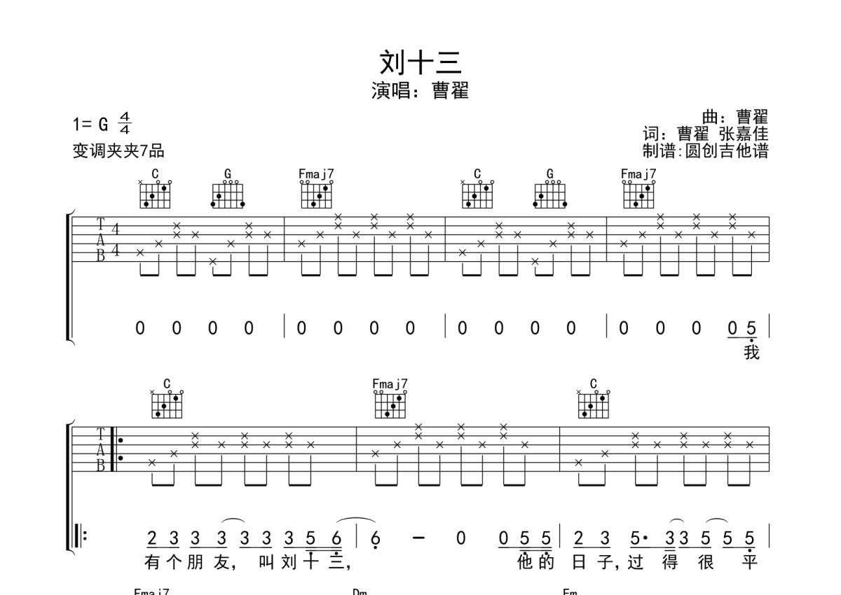 《刘十三》是智哥演唱的一首歌曲,本吉他谱采用的是G调指法编配,这份吉他谱共有三张高清图谱,图谱由 @圆创吉他谱 编配上传,图谱使用六线谱编配,包含吉他和弦指法、简谱以及歌词部分,曲谱配备了相关的音频提供试听,使用这份刘十三吉他谱,可以让你更加方便地掌握这首歌曲的弹唱技巧,快来尝试吧。