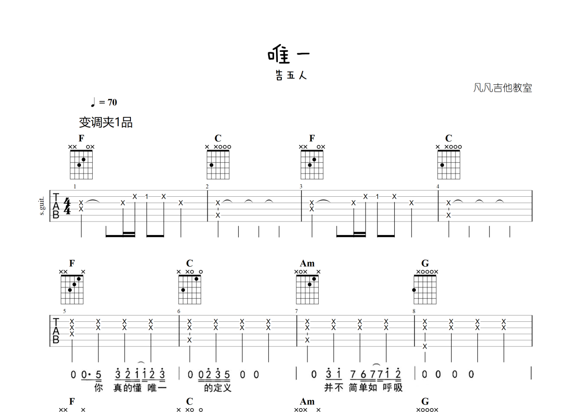 《唯一》是告五人演唱的一首歌曲,简单版,本吉他谱采用的是C调指法编配,这份吉他谱共有两张高清图谱,图谱由 @凡凡吉他教室 编配上传,图谱使用六线谱编配,包含吉他和弦指法、简谱以及歌词部分,曲谱配备了相关的视频提供浏览,使用这份唯一吉他谱,可以让你更加方便地掌握这首歌曲的弹唱技巧,快来尝试吧。告五人《唯一》吉他弹唱谱,采用C调指法编配简单版,凡凡吉他教室编配出品,共有2张高清图谱,免翻页排版设计。