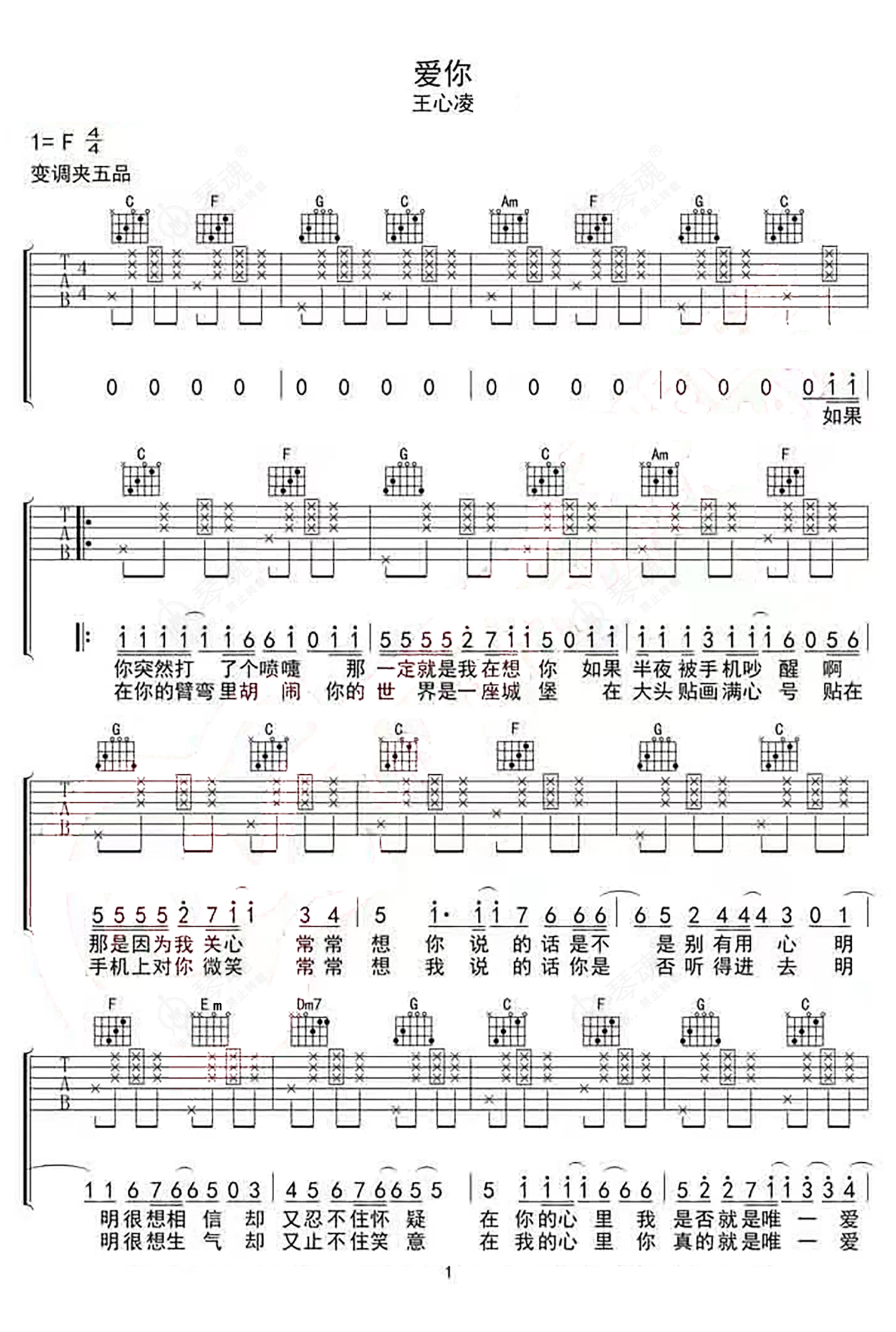 《爱你》是王心凌演唱的一首歌曲,简单版,本吉他谱采用的是C调指法编配,这份吉他谱共有三张高清图谱,图谱由 @凡凡吉他教室 编配上传,图谱使用六线谱编配,包含吉他和弦指法、简谱以及歌词部分,曲谱配备了相关的视频提供浏览,使用这份爱你吉他谱,可以让你更加方便地掌握这首歌曲的弹唱技巧,快来尝试吧。吉他弹唱教学「爱你」王心凌杀疯了,你怎么看?人美歌甜、经典再现。甜心主教,唱这首歌真的会好开心啊 温馨提示:本谱非高清谱。