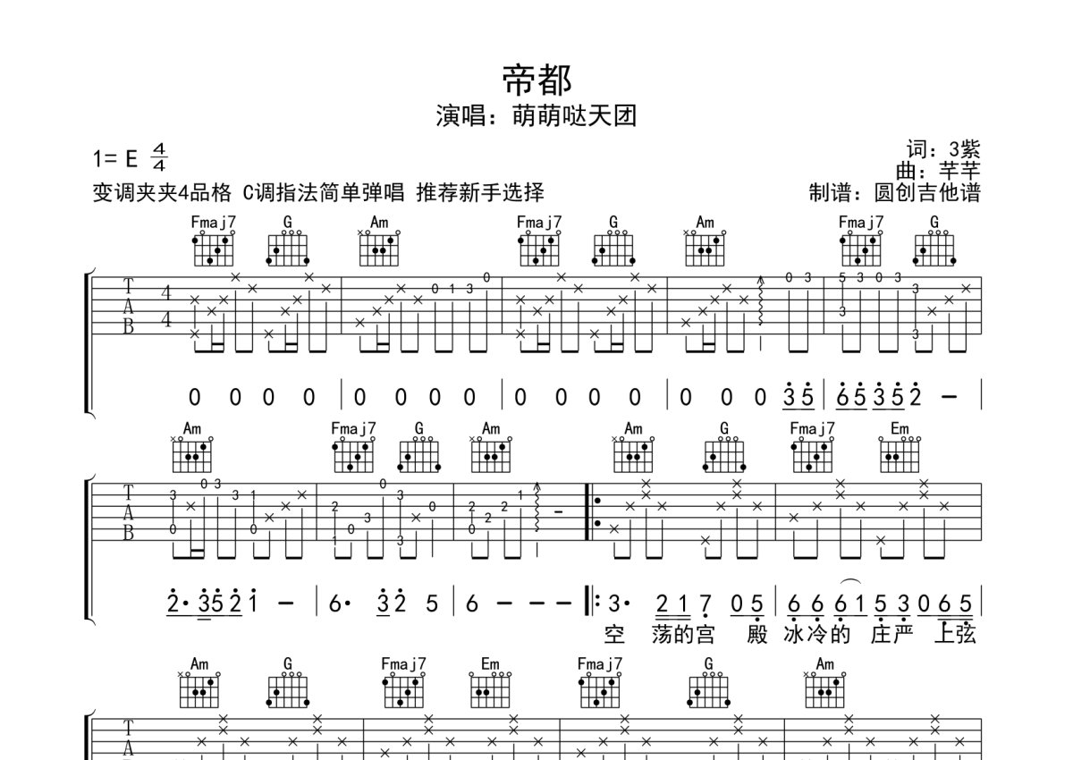 萌萌哒天团《帝都》吉他谱 - C调弹唱六线谱