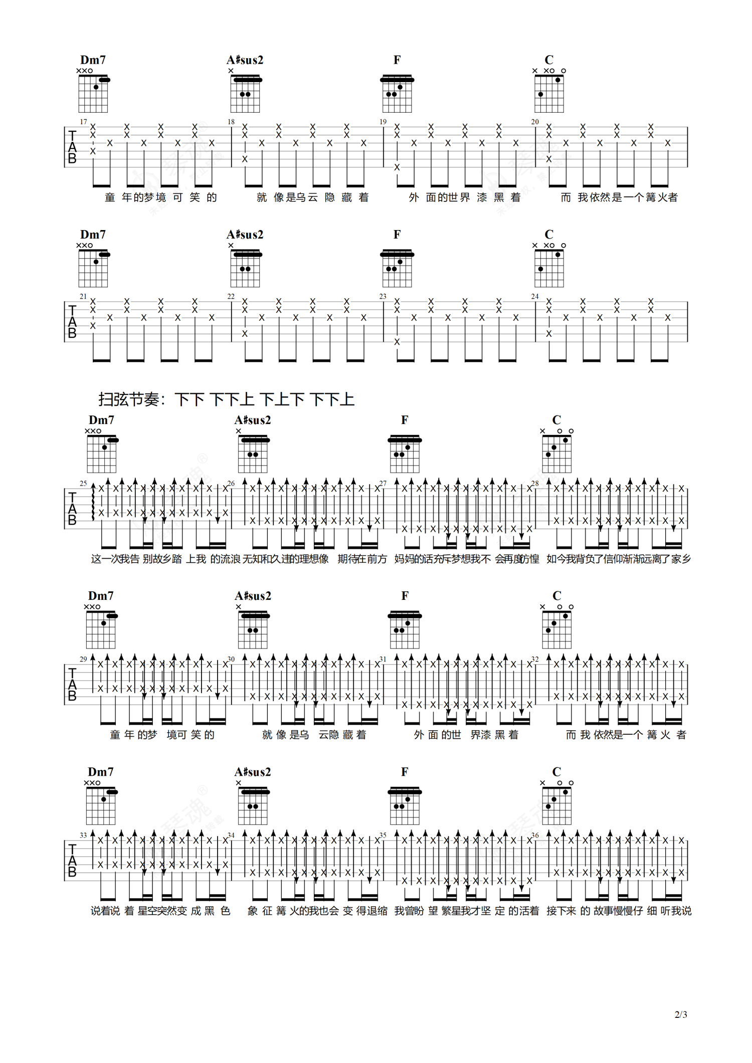 《妈妈的话》是忠宇演唱的一首歌曲,简单版,本吉他谱采用的是F调指法编配,这份吉他谱共有三张高清图谱,图谱由 @凡凡吉他教室 编配上传,图谱使用六线谱编配,包含吉他和弦指法、简谱以及歌词部分,曲谱配备了相关的视频提供浏览,使用这份妈妈的话吉他谱,可以让你更加方便地掌握这首歌曲的弹唱技巧,快来尝试吧。忠宇《妈妈的话》吉他弹唱谱,采用F调指法编配简单版,凡凡吉他教室编配出品,共有3张高清图谱。