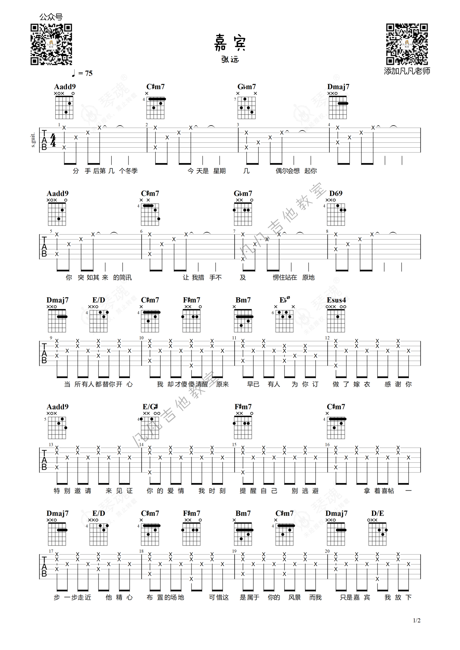 《嘉宾》是张远演唱的一首歌曲,原版,本吉他谱采用的是A调指法编配,这份吉他谱共有两张高清图谱,图谱由 @凡凡吉他教室 编配上传,图谱使用六线谱编配,包含吉他和弦指法、简谱以及歌词部分,曲谱配备了相关的视频提供浏览,使用这份嘉宾吉他谱,可以让你更加方便地掌握这首歌曲的弹唱技巧,快来尝试吧。张远《嘉宾》吉他弹唱谱,采用A调指法编配原版,凡凡吉他教室编配出品,共有2张高清图谱,免翻页排版设计。