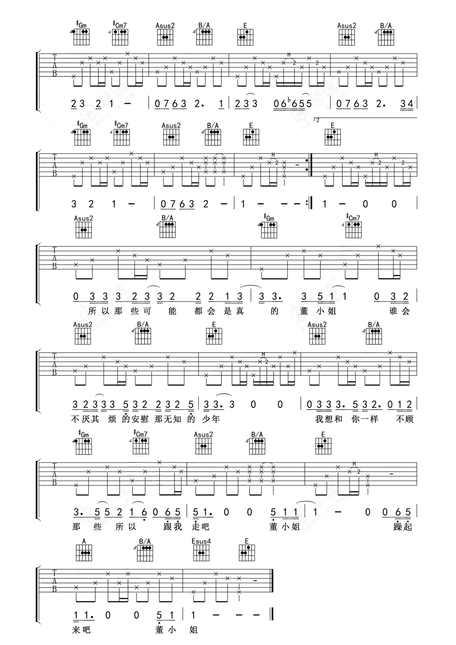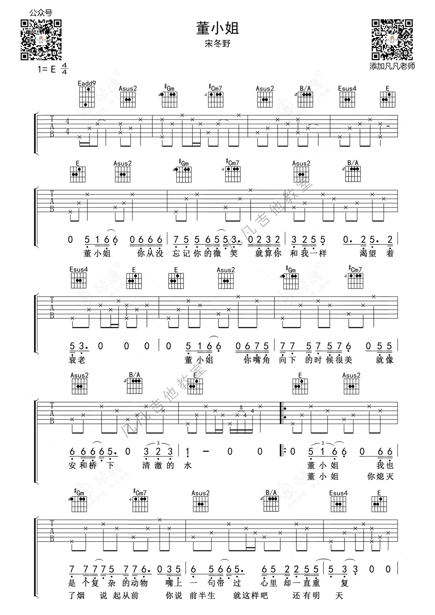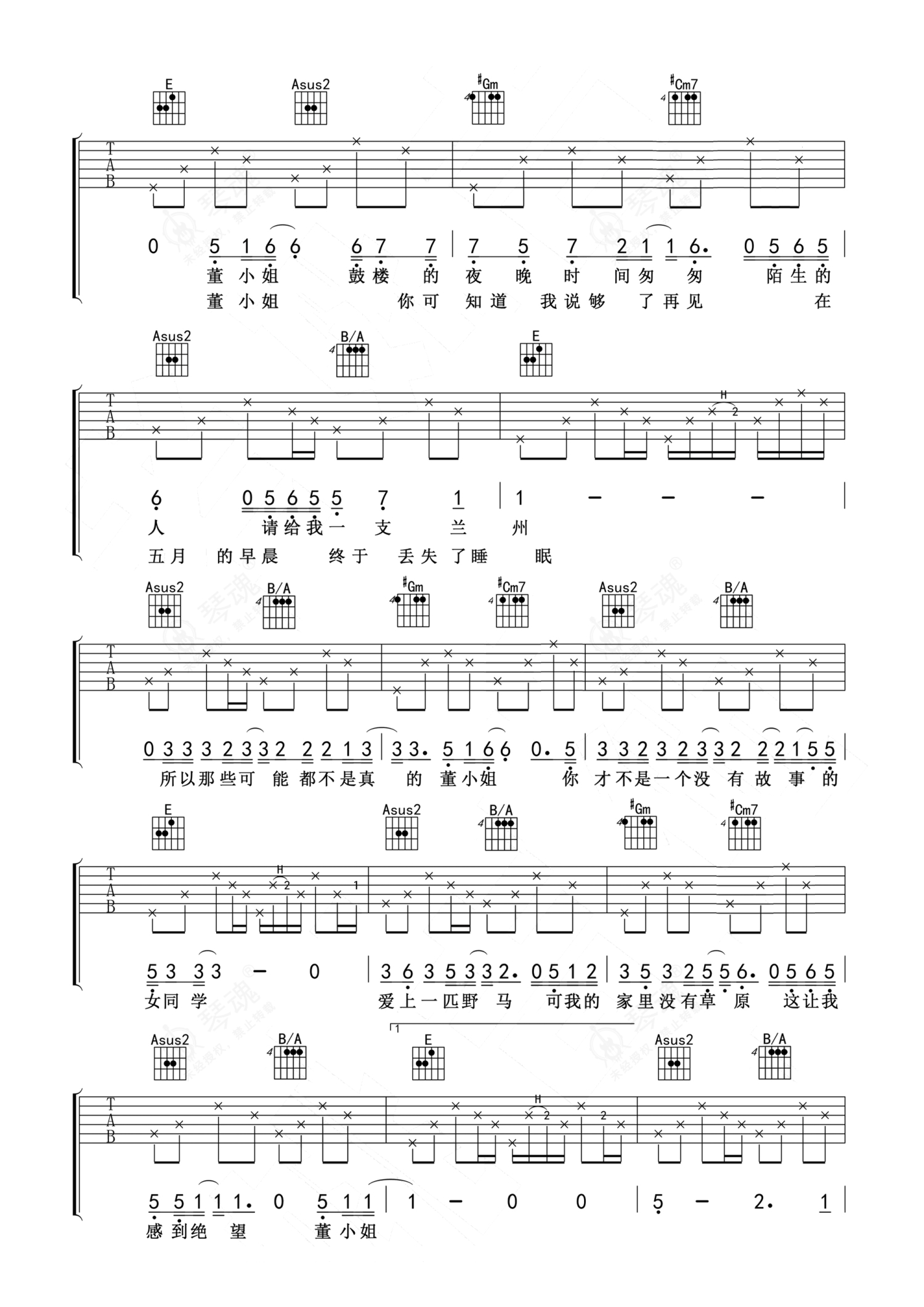 宋冬野《董小姐》吉他谱 - E调弹唱六线谱 - 原版