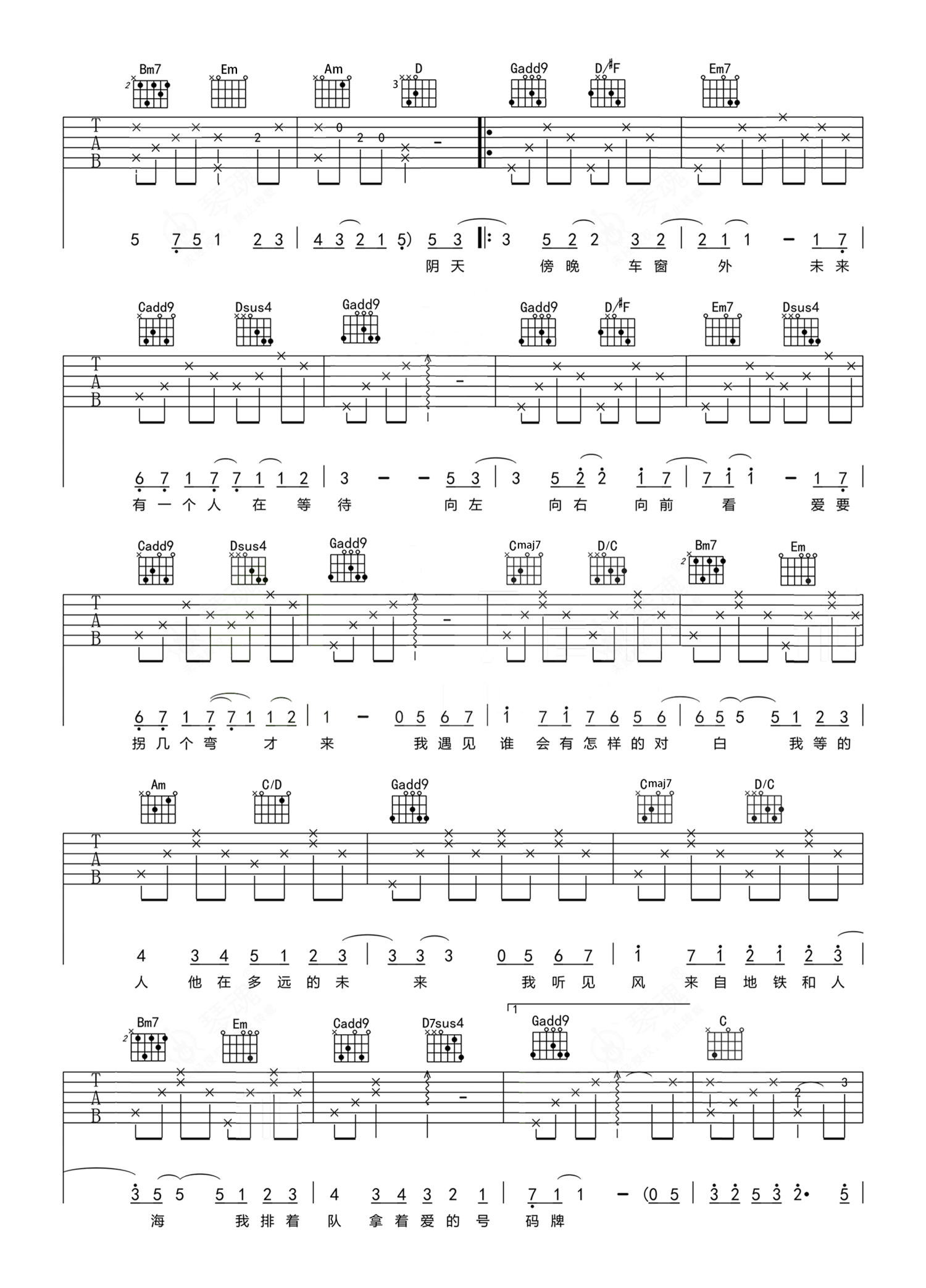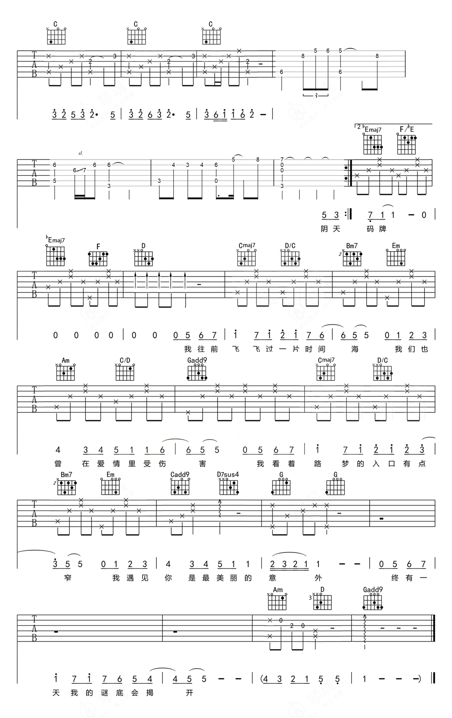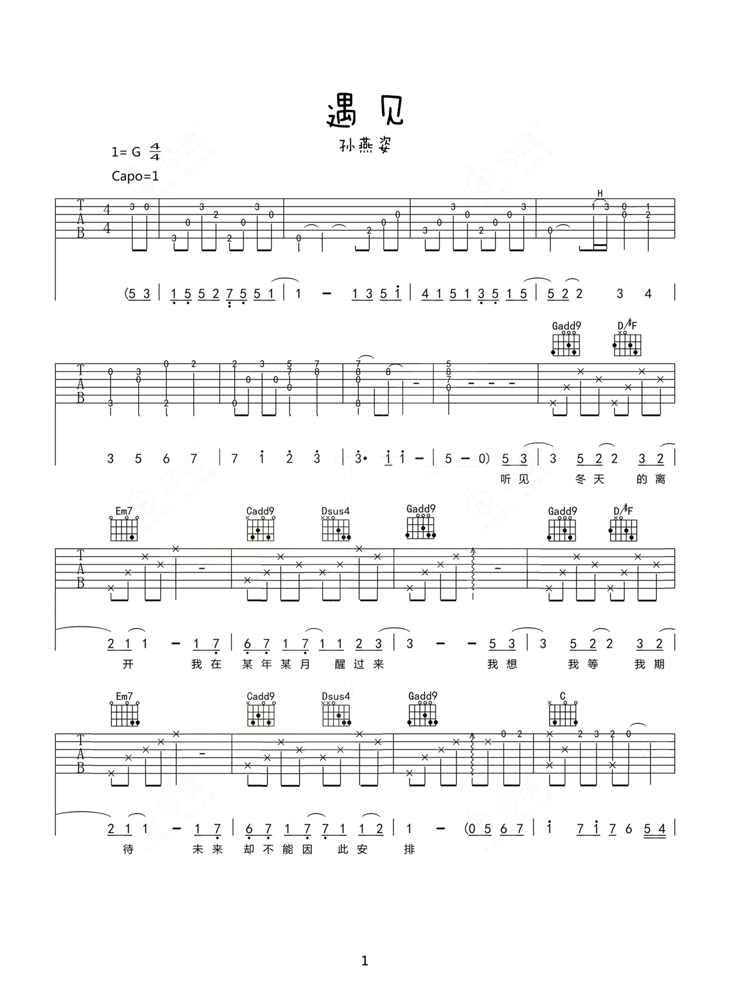孙燕姿《遇见》吉他谱 - G调弹唱六线谱 - 完美原版