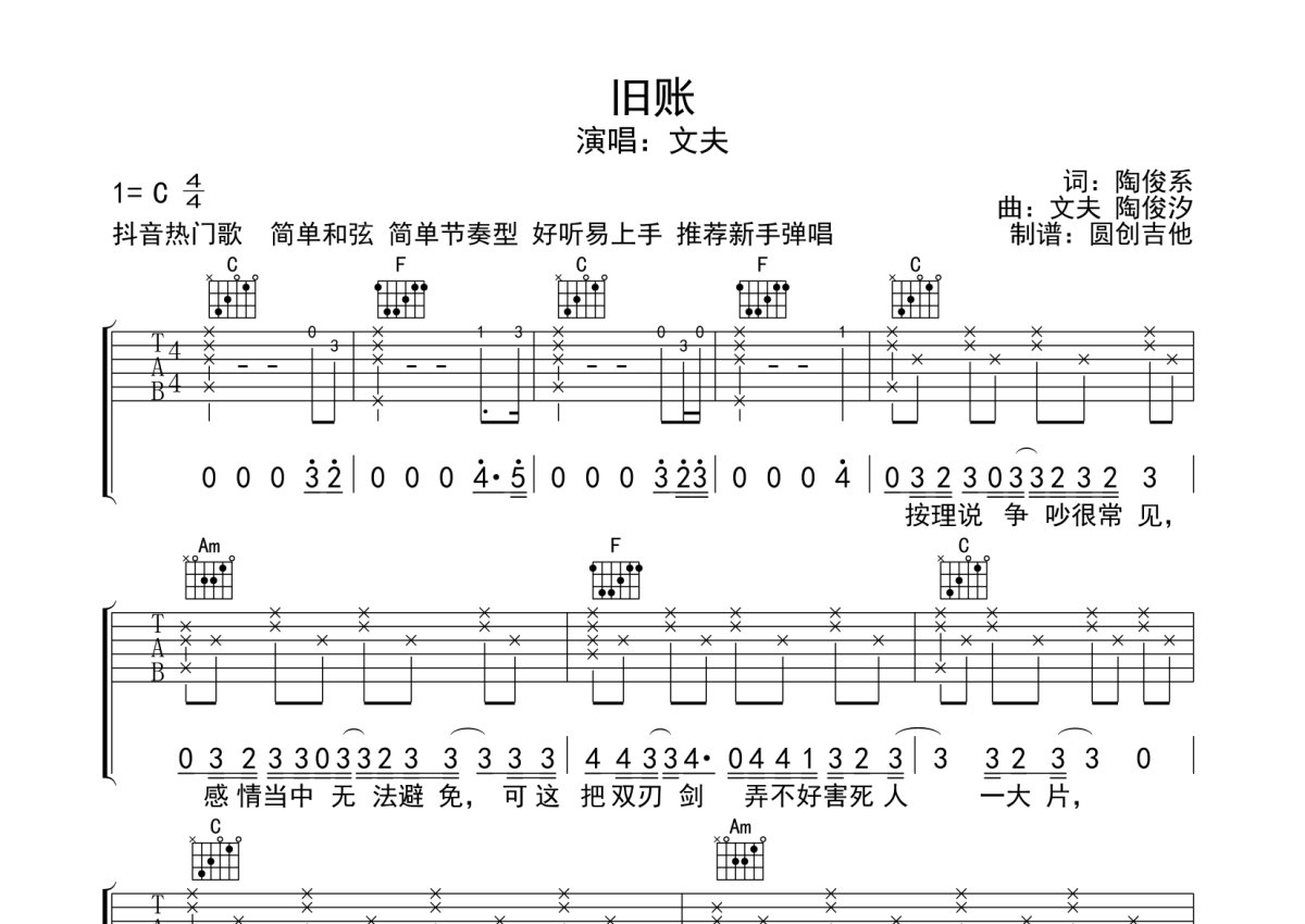 文夫《旧账》吉他谱 - C调弹唱六线谱 - 分解加扫弦编配原版编配