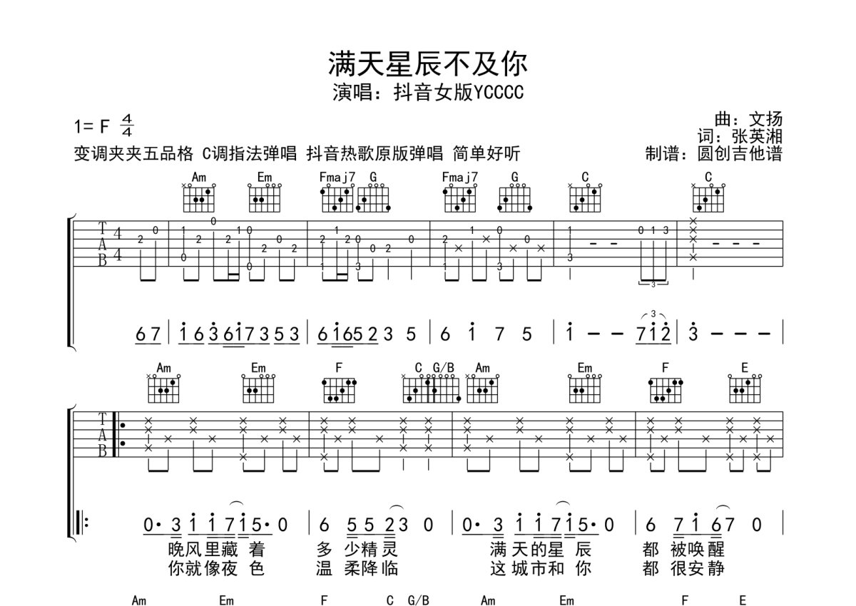 《满天星辰不及你》是YCCCC演唱的一首歌曲,本吉他谱采用的是C调指法编配,这份吉他谱共有三张高清图谱,图谱由 @圆创吉他谱 编配上传,图谱使用六线谱编配,包含吉他和弦指法、简谱以及歌词部分,曲谱配备了相关的音频提供试听,使用这份满天星辰不及你吉他谱,可以让你更加方便地掌握这首歌曲的弹唱技巧,快来尝试吧。抖音热门歌曲 好听 好弹 原版弹唱。
