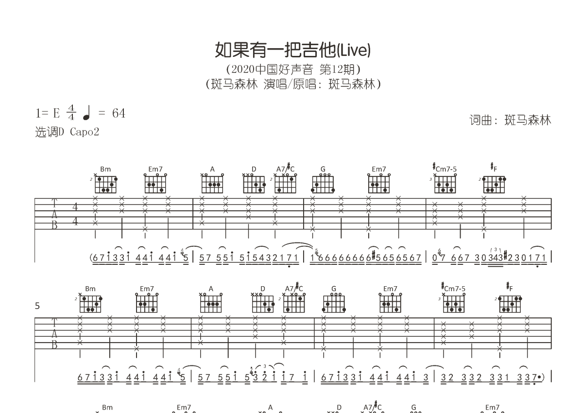 斑马森林《如果有一把》吉他谱 - D调弹唱六线谱