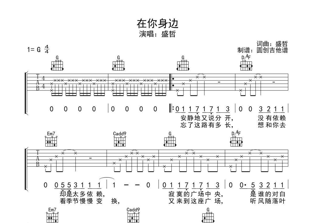 盛哲《在你身边》吉他谱 - G调弹唱六线谱