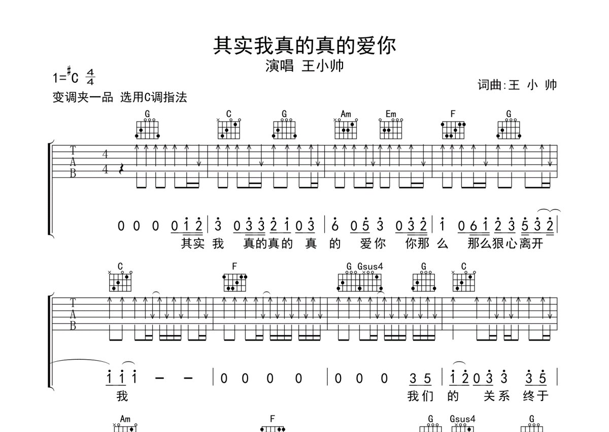 王小帅《其实我真的爱你》吉他谱 - C调弹唱六线谱