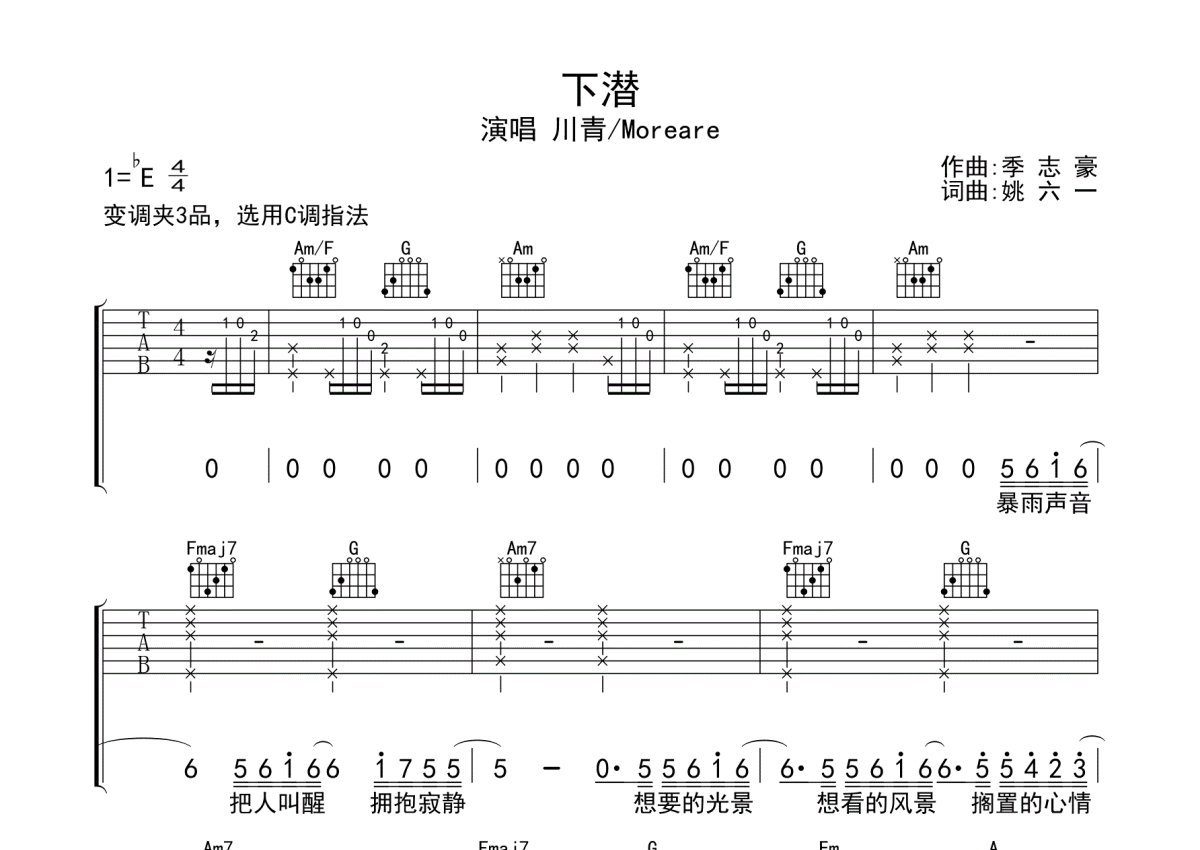 川青/Moreare《下潜》吉他谱 - C调弹唱六线谱