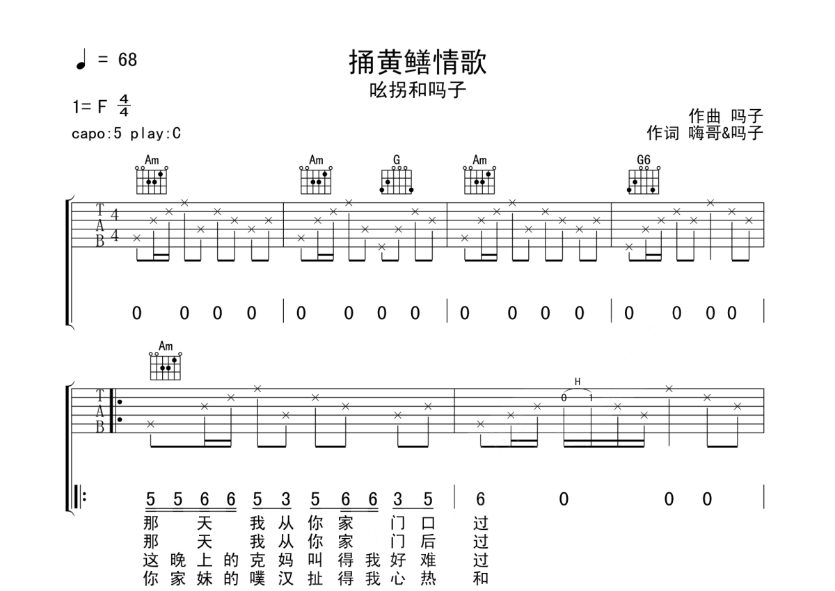 吆拐和吗子《捅黄鳝情歌》吉他谱 - C调弹唱六线谱