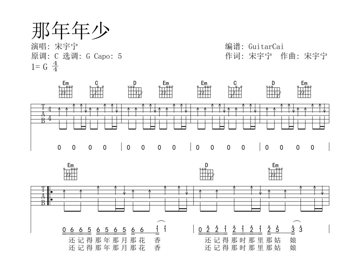宋宇宁《那年年少》吉他谱 - G调弹唱六线谱 - 扫弦简易版