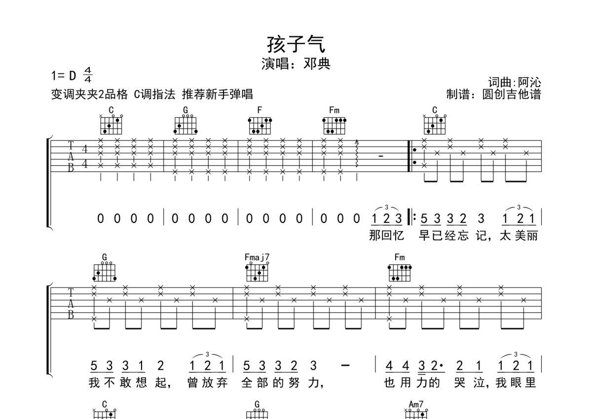 邓典《孩子气》吉他谱 - C调弹唱六线谱