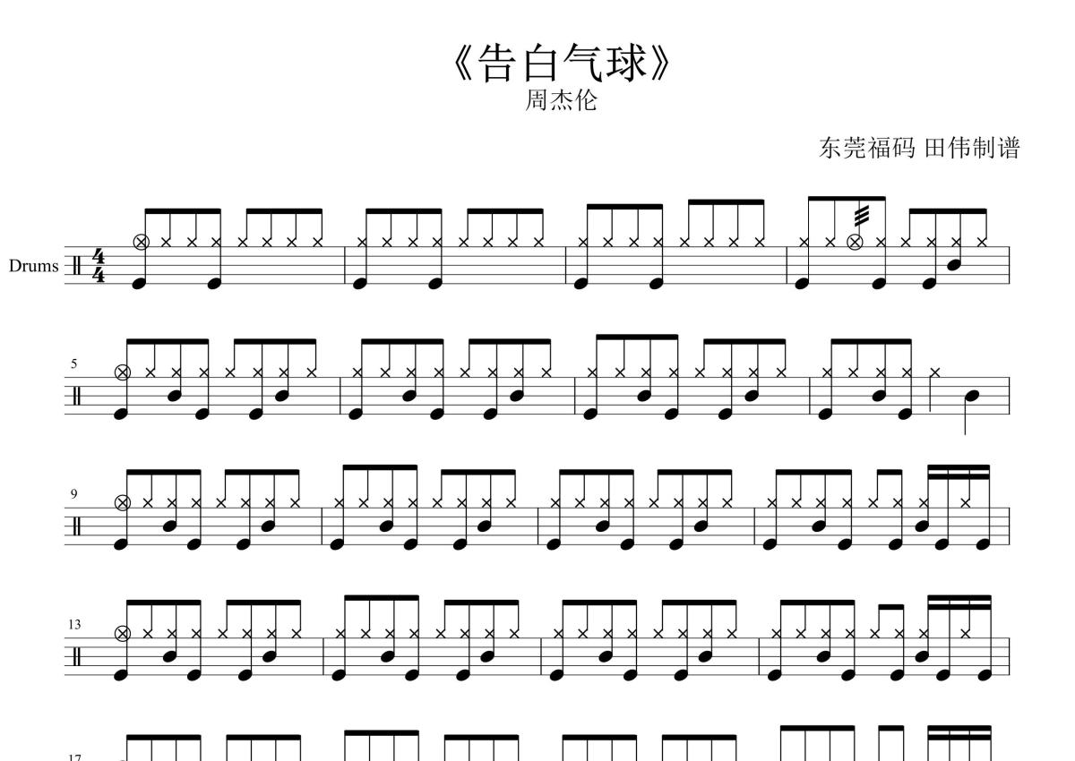 《告白气球》是周杰伦演唱的一首歌曲,这份鼓谱共有两张高清图谱,图谱由 @田伟制谱工作室 编配上传,图谱使用五线谱编配,使用这份告白气球架子鼓谱,你将能够轻松地敲打出这首周杰伦的告白气球,快来尝试吧。