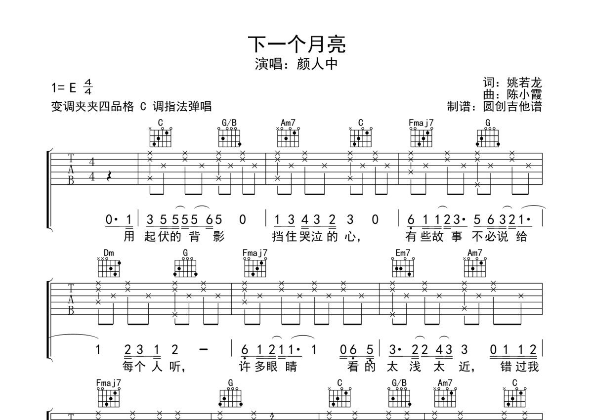 颜人中《下一个月亮》吉他谱 - E调弹唱六线谱