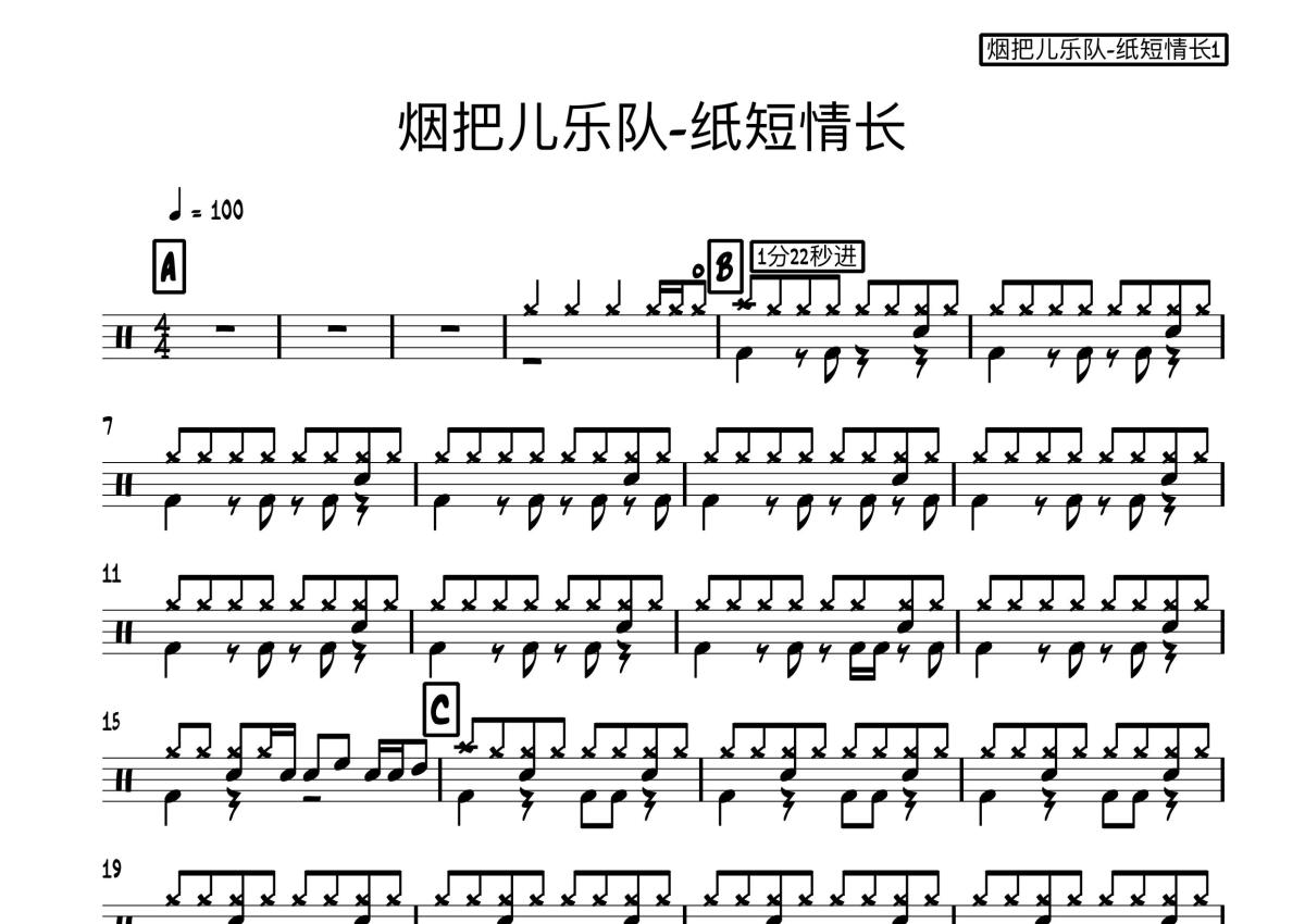 烟把儿乐队《纸短情长》鼓谱 - 架子鼓谱