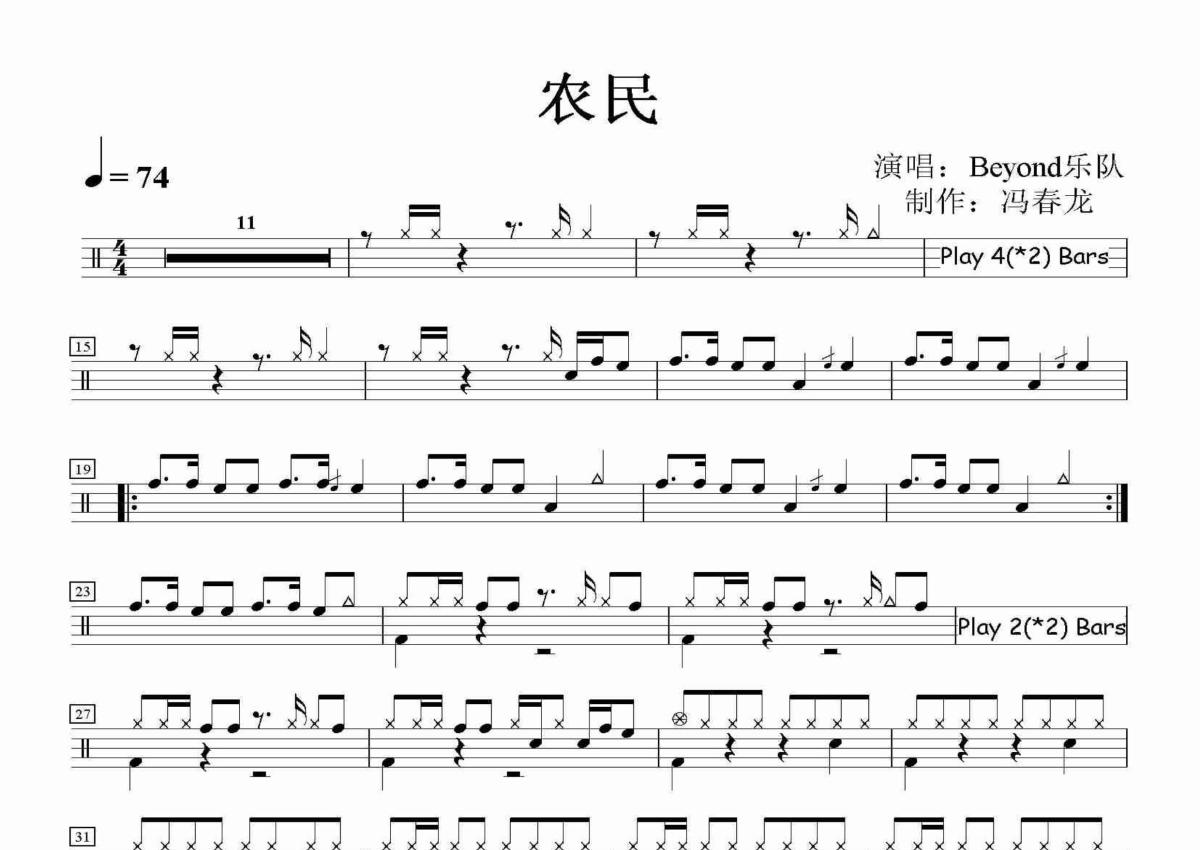 《农民》是Beyond演唱的一首歌曲,这份鼓谱共有两张高清图谱,图谱由 @田伟制谱工作室 编配上传,图谱使用五线谱编配,使用这份农民架子鼓谱,你将能够轻松地敲打出这首Beyond的农民,快来尝试吧。
