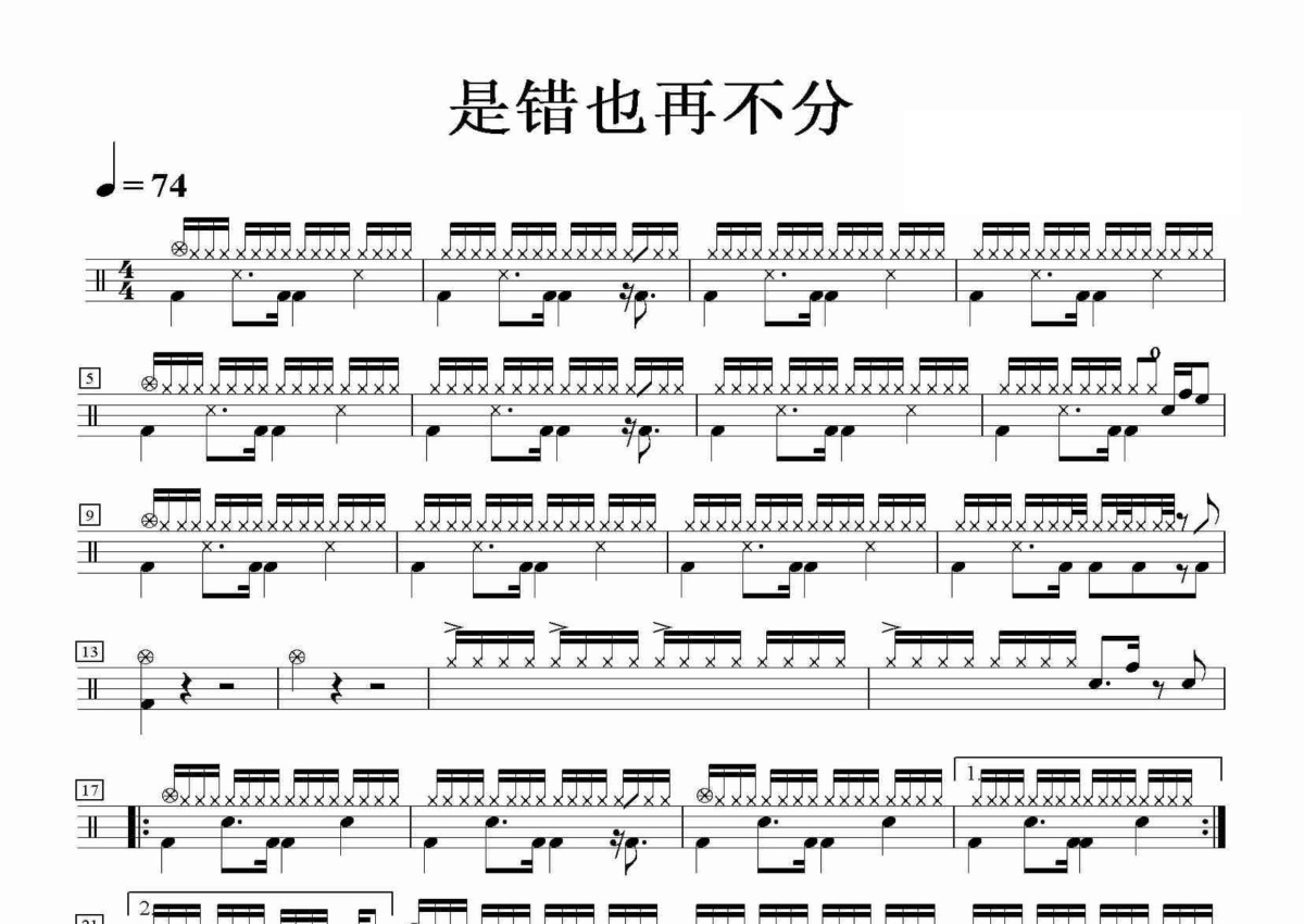 《是错也再不分》是Beyond演唱的一首歌曲,这份鼓谱共有两张高清图谱,图谱由 @田伟制谱工作室 编配上传,图谱使用五线谱编配,使用这份是错也再不分架子鼓谱,你将能够轻松地敲打出这首Beyond的是错也再不分,快来尝试吧。