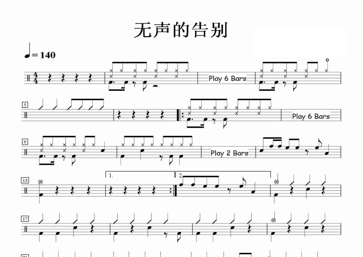 《无声的告别》是Beyond演唱的一首歌曲,这份鼓谱共有两张高清图谱,图谱由 @田伟制谱工作室 编配上传,图谱使用五线谱编配,使用这份无声的告别架子鼓谱,你将能够轻松地敲打出这首Beyond的无声的告别,快来尝试吧。