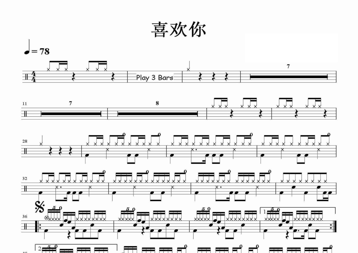 《喜欢你》是Beyond演唱的一首歌曲,这份鼓谱共有两张高清图谱,图谱由 @田伟制谱工作室 编配上传,图谱使用五线谱编配,使用这份喜欢你架子鼓谱,你将能够轻松地敲打出这首Beyond的喜欢你,快来尝试吧。