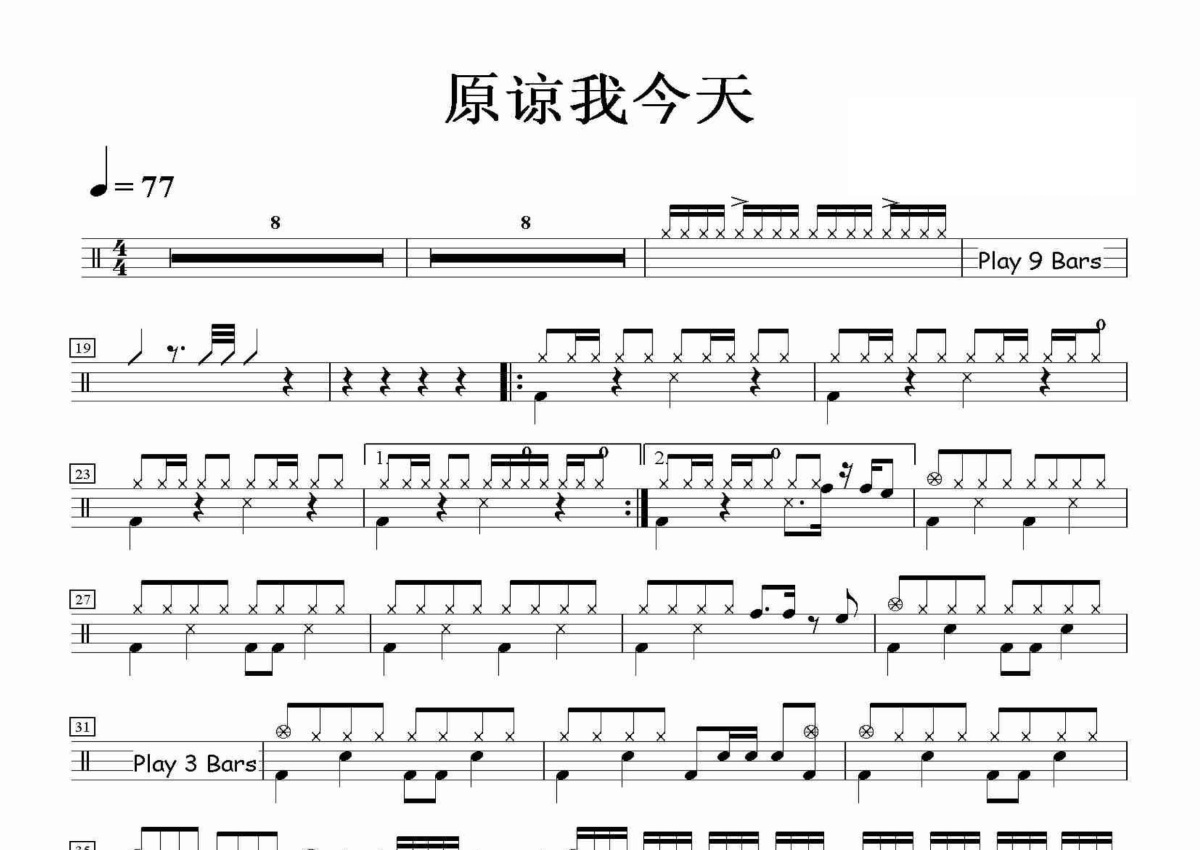 《原谅我今天》是Beyond演唱的一首歌曲,这份鼓谱共有两张高清图谱,图谱由 @田伟制谱工作室 编配上传,图谱使用五线谱编配,使用这份原谅我今天架子鼓谱,你将能够轻松地敲打出这首Beyond的原谅我今天,快来尝试吧。