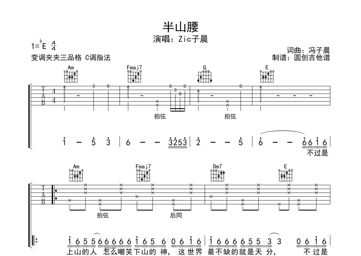冯子晨《半山腰》吉他谱 - C调弹唱六线谱