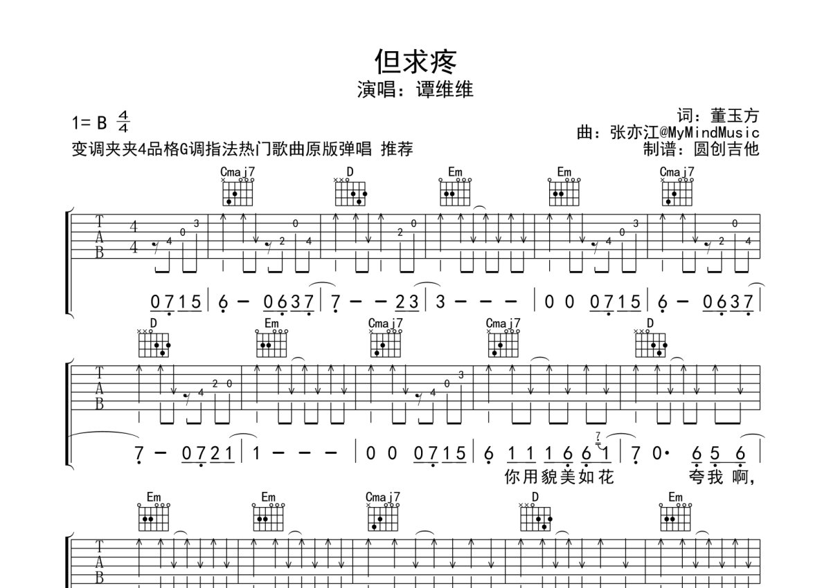 《但求疼》是谭维维演唱的一首歌曲,本吉他谱采用的是G调指法编配,这份吉他谱共有五张高清图谱,图谱由 @圆创吉他谱 编配上传,图谱使用六线谱编配,包含吉他和弦指法、简谱以及歌词部分,曲谱配备了相关的音频提供试听,使用这份但求疼吉他谱,可以让你更加方便地掌握这首歌曲的弹唱技巧,快来尝试吧。