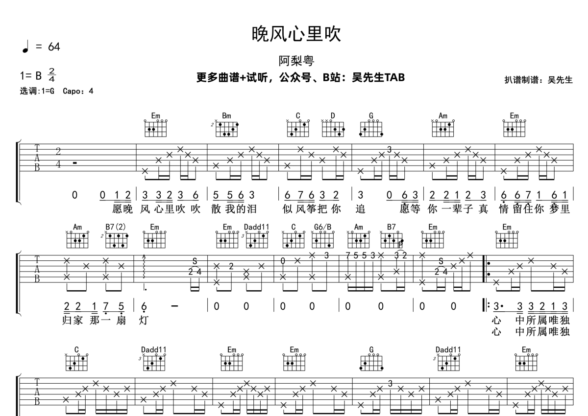 阿梨粤《晚风心里吹》吉他谱 - G调弹唱六线谱