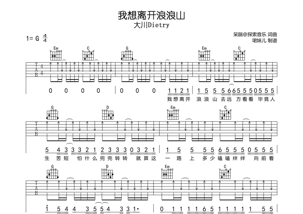 大川Dietry《我想离开浪浪山》吉他谱 - G调弹唱六线谱