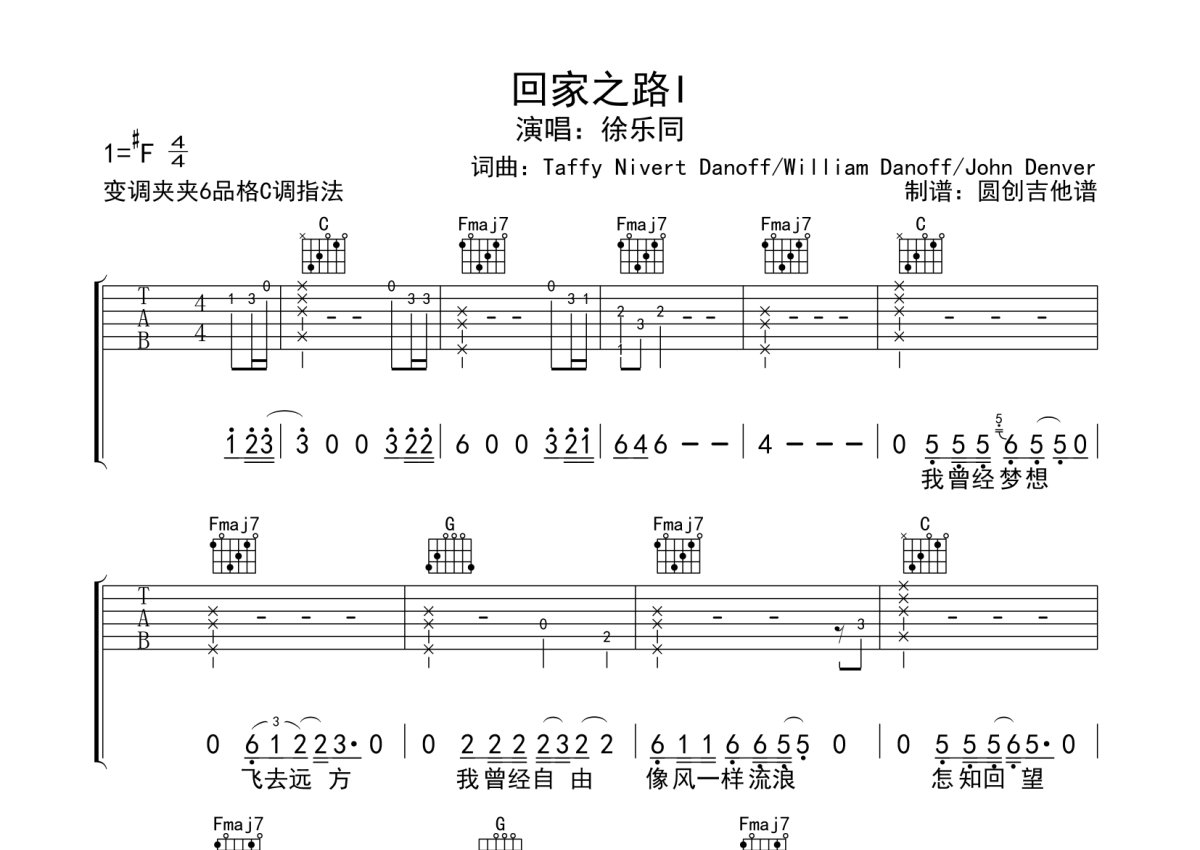 徐乐同《回家之路》吉他谱 - C调弹唱六线谱