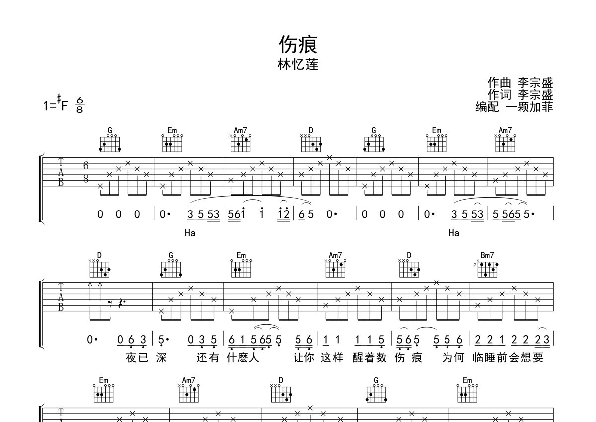 林忆莲《伤痕》吉他谱 - G调弹唱六线谱