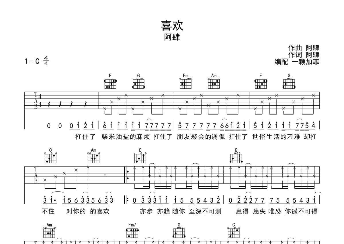 阿肆《喜欢》吉他谱 - C调弹唱六线谱