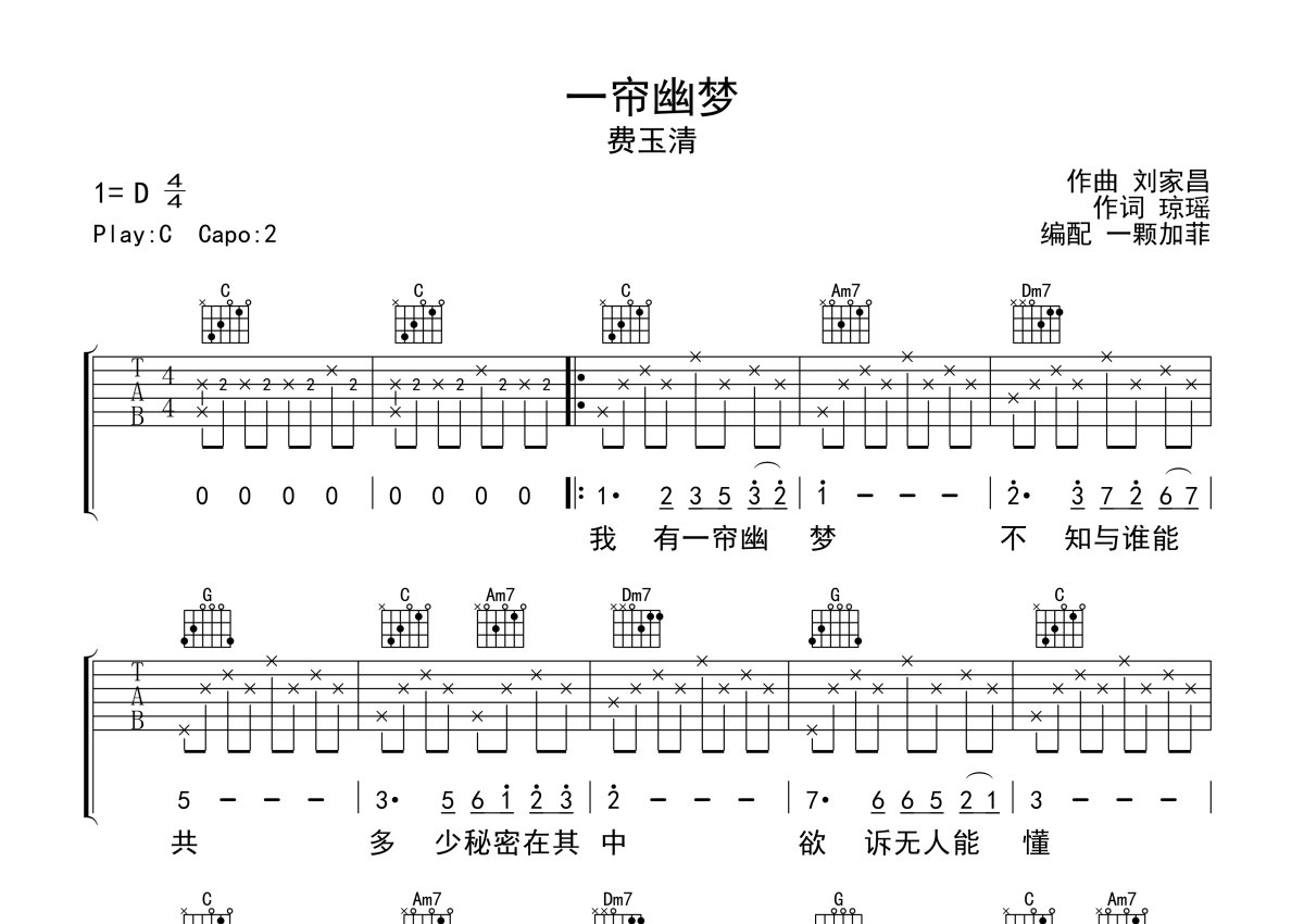 费玉清《一帘幽梦》吉他谱 - C调弹唱六线谱